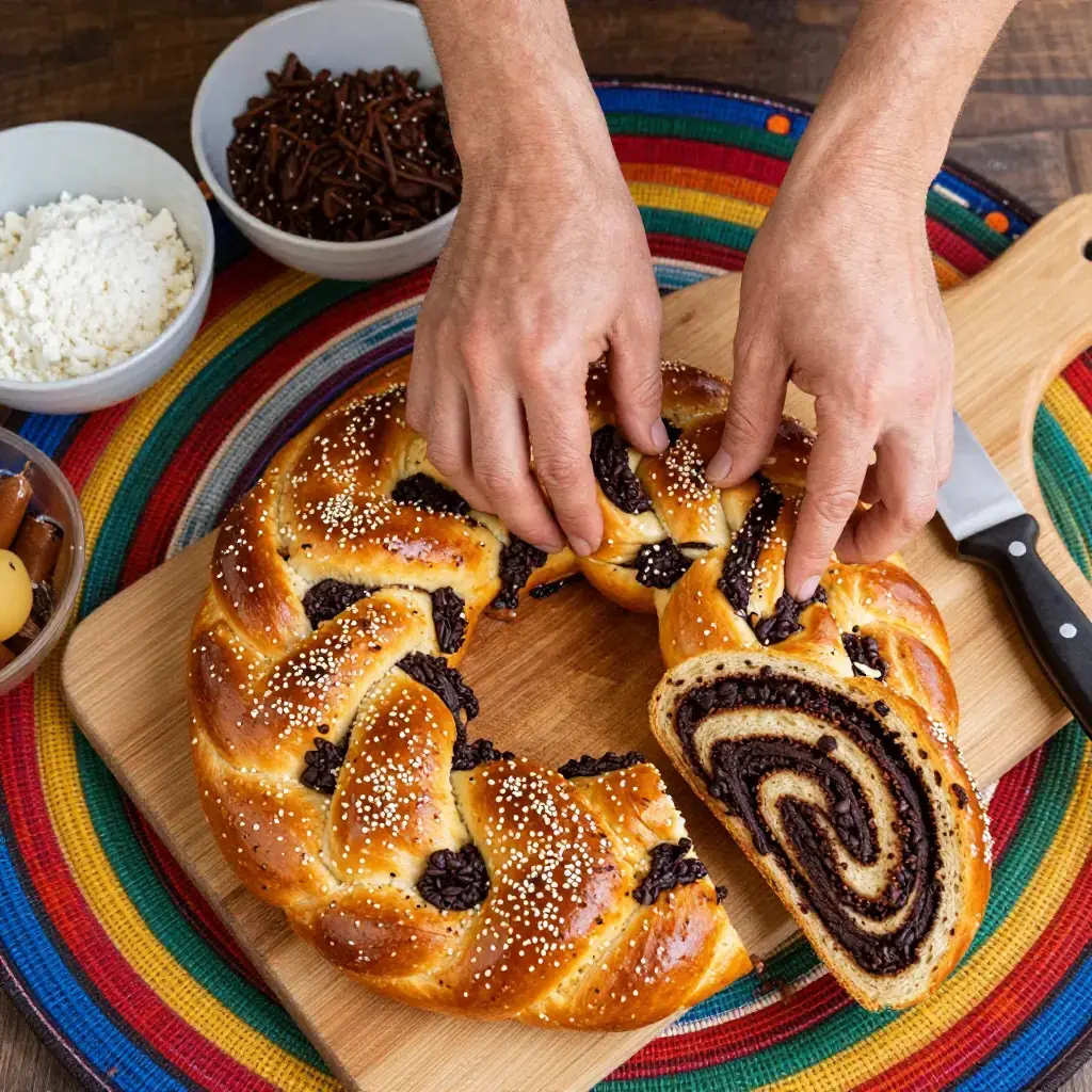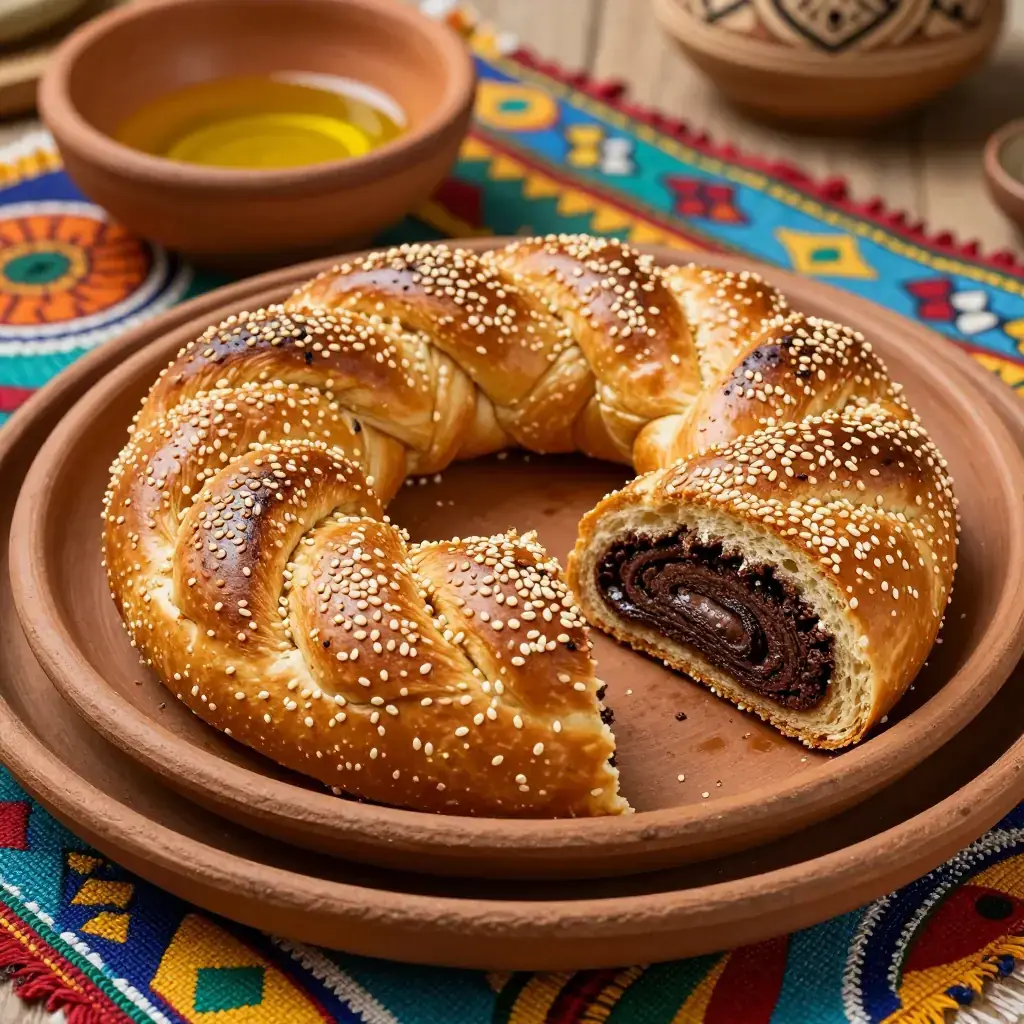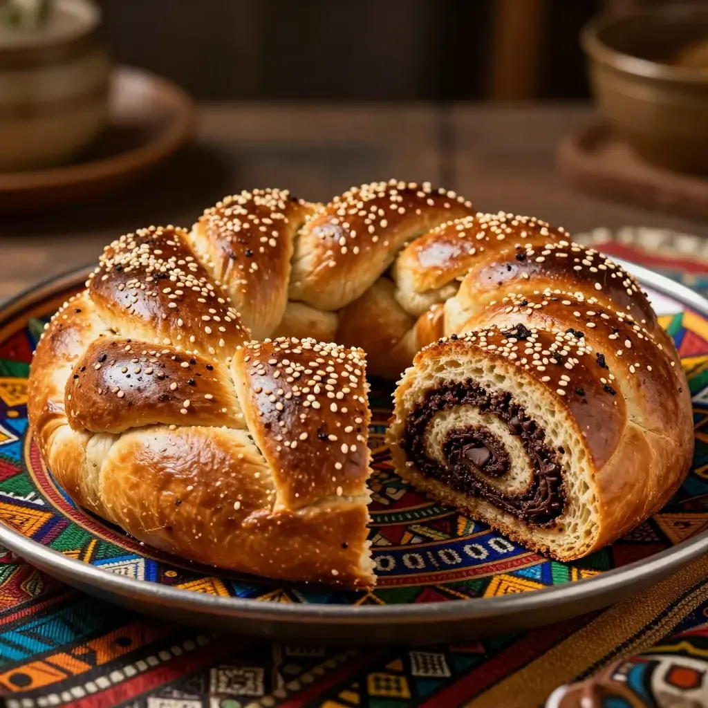 # Himbasha be Tikur Inkulal Kek (Ethiopian Chocolate-Spiced Celebration Bread-Cake) Himbasha is the traditional ceremonial sweet bread of Ethiopia and Eritrea, baked for weddings, holidays, and religious celebrations. This modern-fusion interpretation incorporates dark chocolate and cardamom into the enriched dough, bridging the traditional himbasha's gentle sweetness with contemporary patisserie influence. It makes a stunning centerpiece for festive occasions. Serves: 8 ## Ingredients **Dough:** - 500g (4 cups) plain flour - 7g (2¼ tsp) instant yeast - 80g (⅓ cup) caster sugar - 1 tsp ground cardamom - ½ tsp ground cinnamon - ½ tsp ground coriander seed - ½ tsp salt - 2 eggs - 180ml (¾ cup) warm milk - 80g (5½ tbsp) unsalted butter, softened **Chocolate filling:** - 100g (3½ oz) dark chocolate (70%), finely chopped - 2 tbsp (25g) brown sugar - 1 tsp ground cardamom - 30g (2 tbsp) softened butter **Glaze:** - 1 tbsp honey - 1 tbsp warm water - 1 tbsp sesame seeds ## Instructions 1. Whisk flour, yeast, sugar, spices, and salt in a large bowl. Make a well; add eggs, warm milk, and softened butter. Mix to a shaggy dough, then knead 10 minutes until smooth and elastic. Cover and prove 1 hour until doubled. 2. Mix chocolate filling ingredients together until smooth. 3. Punch down dough and roll on a floured surface into a 30x40cm (12x16 inch) rectangle. Spread chocolate filling evenly, leaving a 2cm border. 4. Roll tightly from the long edge into a log. Slice into 3 equal ropes, braid them together, and form into a round loaf by coiling the braid. Place in a 25cm (10 inch) round greased tin. 5. Prove a further 45 minutes until noticeably puffed. Preheat oven to 180°C (350°F). 6. Brush with honey glaze and scatter sesame seeds. Bake 30-35 minutes until deep golden-brown and hollow-sounding when tapped. Internal temperature should reach 90°C (195°F). 7. Brush again with honey glaze while hot. Cool 20 minutes before slicing. **Cook's Notes:** Traditional himbasha uses fenugreek and coriander seeds — these are preserved in this recipe. The chocolate is a modern addition; omit it and increase sugar by 2 tbsp for the traditional version. Himbasha keeps well wrapped for 3 days.Images