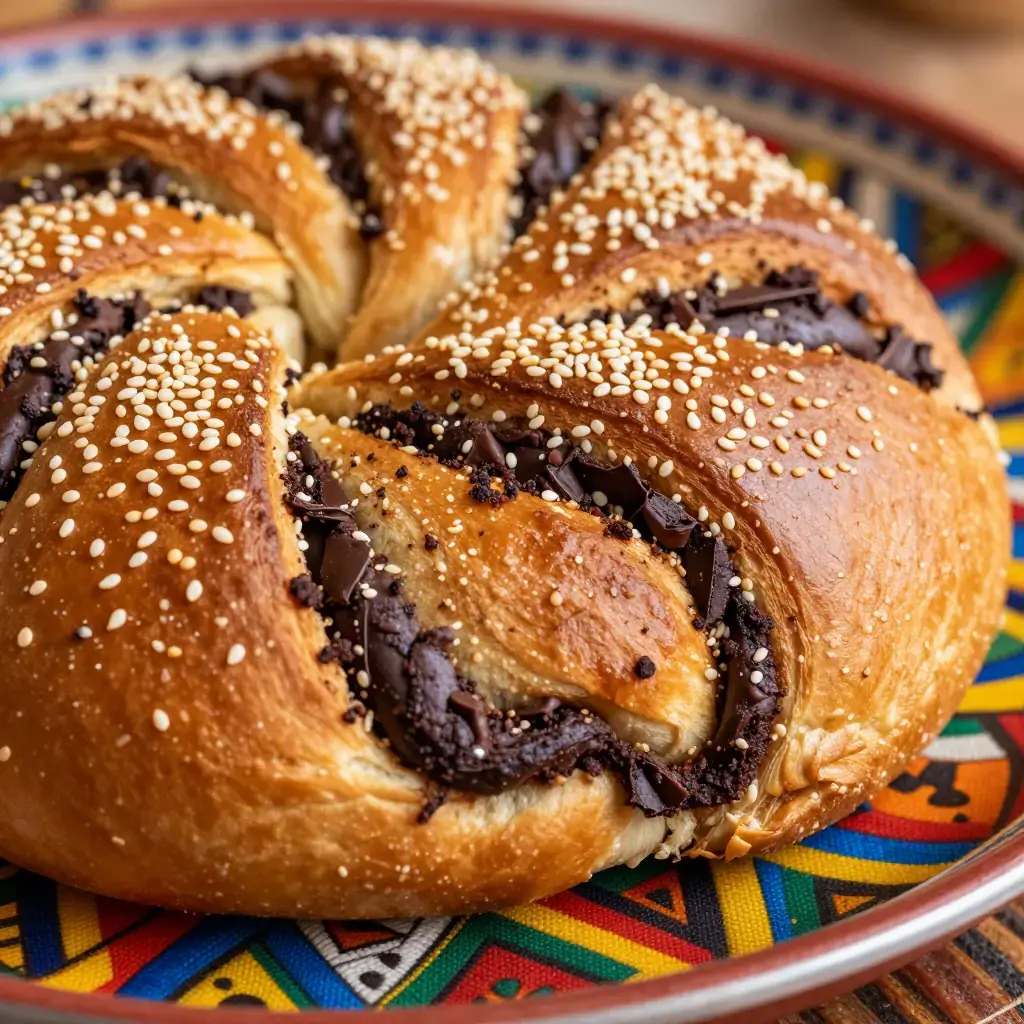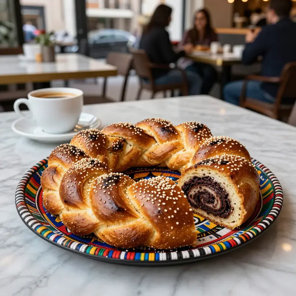 Himbasha is the traditional ceremonial sweet bread of Ethiopia and Eritrea, baked for weddings, holidays, and religious celebrations. This modern-fusion interpretation incorporates dark chocolate and cardamom into the enriched dough, bridging the traditional himbasha's gentle sweetness with contemporary patisserie influence. It makes a stunning centerpiece for festive occasions.