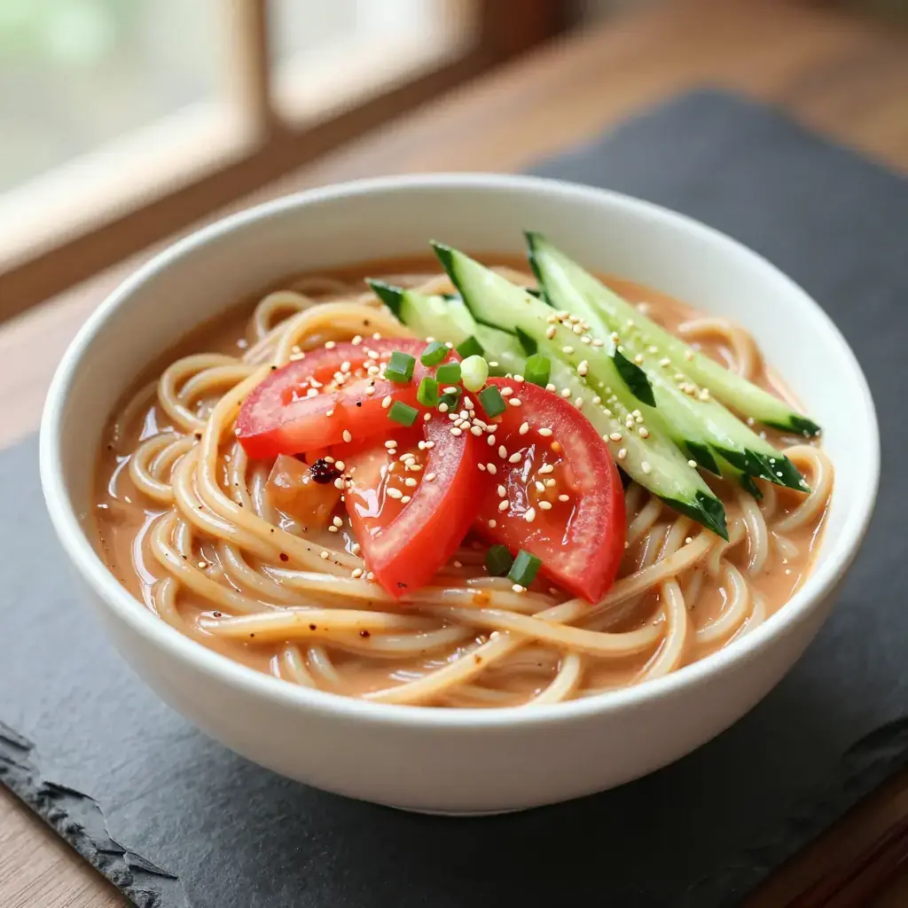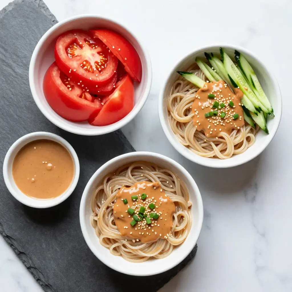 - Divide the cold noodles among four bowls. Top each with julienned cucumber, diced fresh tomato and spring onions.