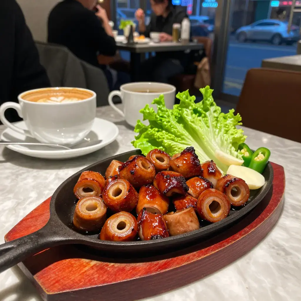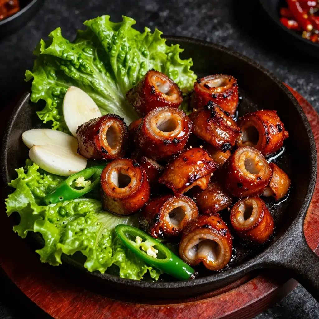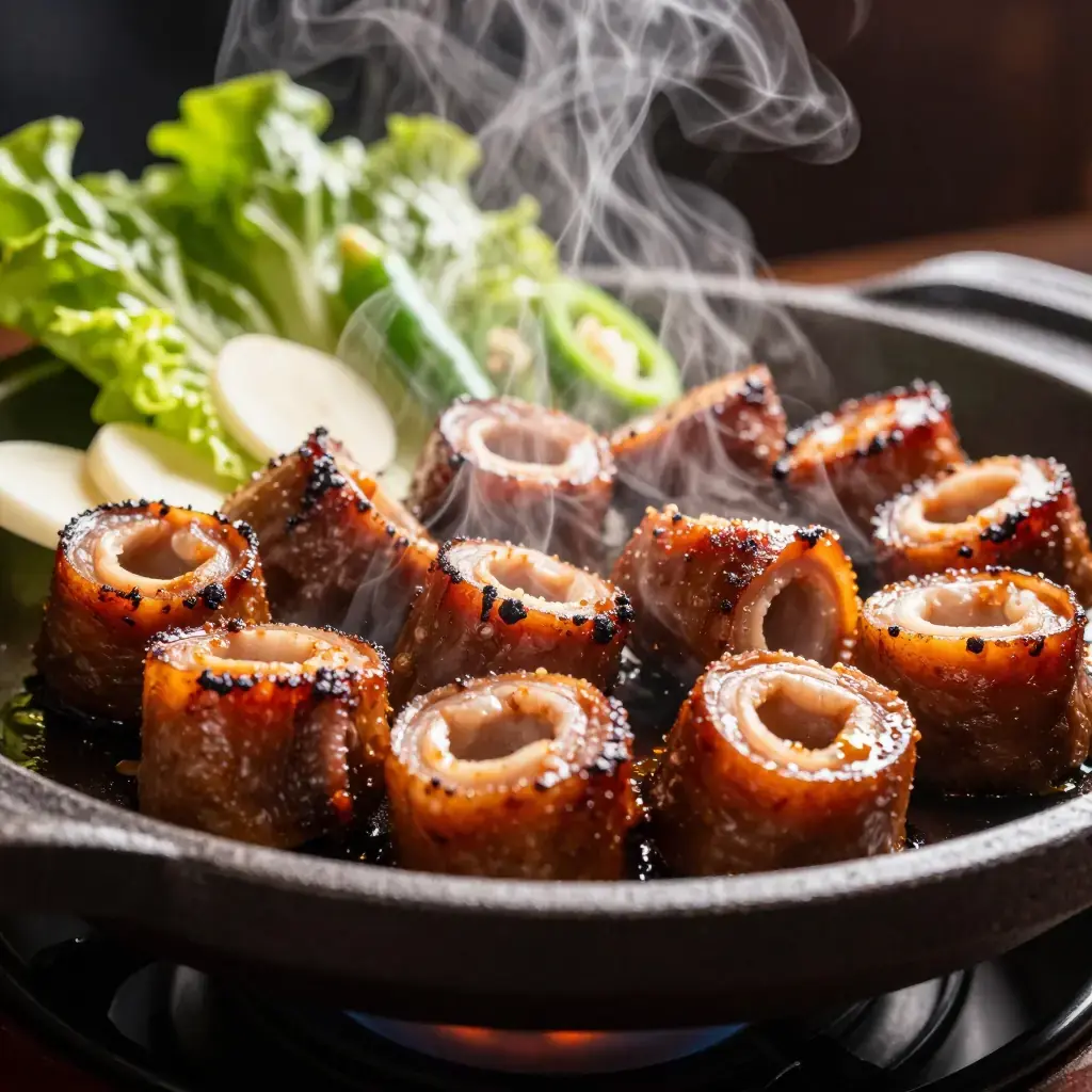 Grilled small intestines (gopchang) have been eaten in Korea for centuries, with records from the Joseon dynasty describing intestine preparation as a palace-kitchen art. Today gopchang gui is synonymous with late-night Seoul dining — the intestines sizzle and blister on tabletop grills, releasing a rich, fatty smoke that perfumes the entire alley. The cleaning and seasoning method is everything: without proper care, the offal is pungent; done well, it is revelatory.