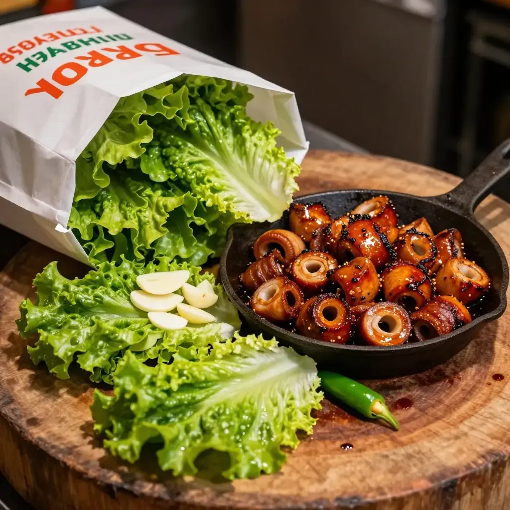 - Serve immediately on the grill or a hot plate, with lettuce for wrapping, garlic, green chilli, and soy sauce.