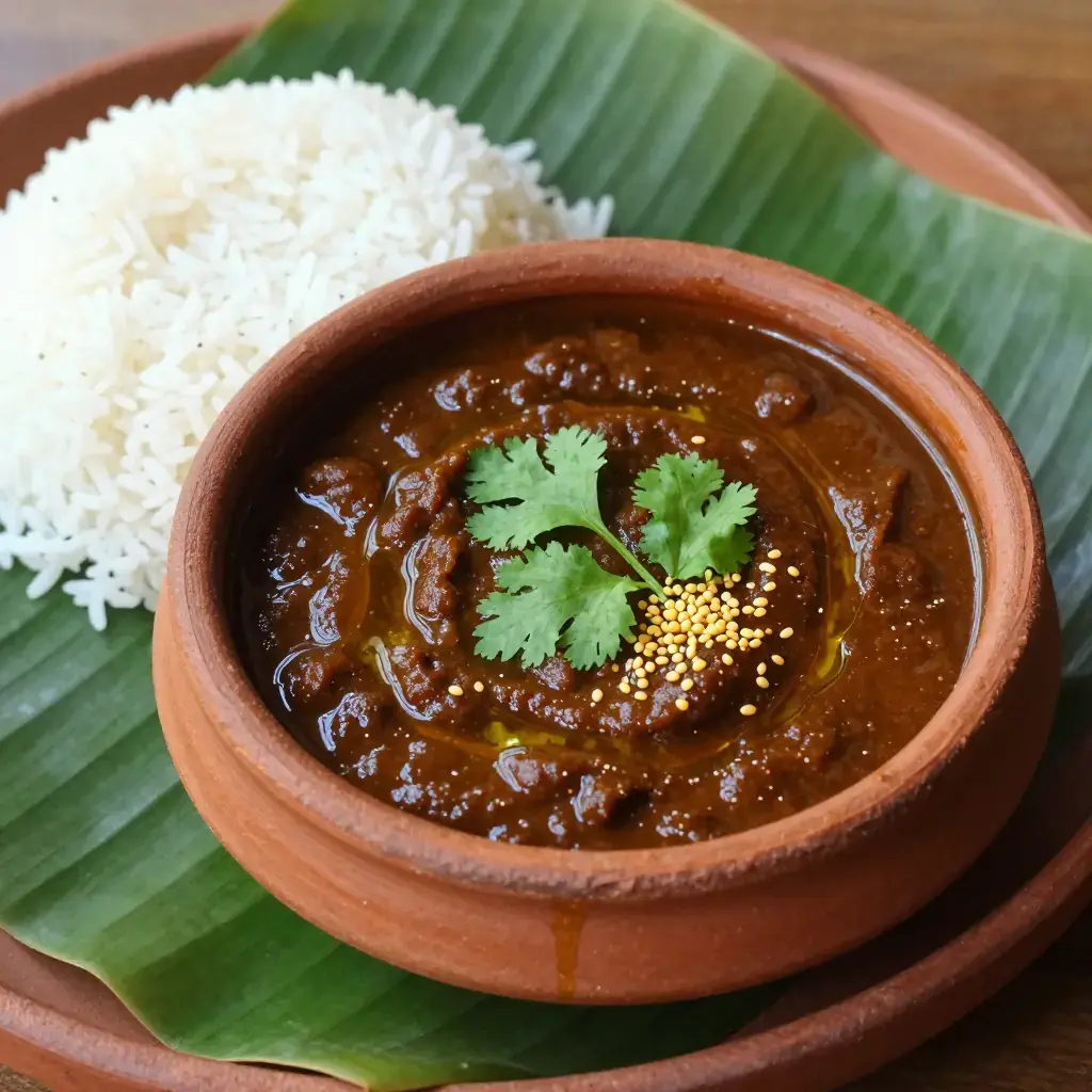 # Paruppu Kuzhambu Paruppu Kuzhambu is the heartland dish of Tamil Nadu — a thick, tangy, deeply spiced curry made from toor dal (split pigeon peas) and soured with tamarind. Unlike the thinner sambar, kuzhambu is a dense, coating curry served in small quantities over rice. Every family has their own precise recipe, passed through generations, and it remains one of the most comforting meals in South Indian cuisine. Serves: 4 ## Ingredients - 200g (1 cup) toor dal (split pigeon peas), rinsed - 700ml (3 cups) water, for cooking dal - 50g (2 oz) tamarind block, soaked in 250ml / 1 cup hot water, pulp extracted - 2 tbsp (30ml) sesame oil (gingelly oil) or coconut oil - 1 tsp mustard seeds - 10-12 fresh curry leaves - 2 dried red chillies - 1 medium onion, finely chopped - 3 garlic cloves, finely chopped - 2 medium tomatoes, chopped - 1½ tsp sambar powder - ½ tsp turmeric powder - 1 tsp red chilli powder - Salt, to taste - 1 tbsp jaggery or brown sugar - Fresh coriander leaves, to garnish ## Instructions 1. Pressure cook or boil toor dal with 700ml water and ½ tsp turmeric until completely soft and mushy, about 20-25 minutes. Whisk until smooth. Set aside. 2. Heat sesame oil in a heavy-bottomed pot over medium-high heat. Add mustard seeds and let them splutter, about 30 seconds. 3. Add curry leaves and dried red chillies — they will crackle and pop. Immediately add onion and garlic. Fry for 6-8 minutes until the onion is golden brown. 4. Add tomatoes and cook for 5-6 minutes until completely broken down and the oil begins to separate at the edges. 5. Add sambar powder, remaining turmeric, and red chilli powder. Fry for 1 minute, stirring constantly. 6. Pour in the tamarind extract and bring to a brisk boil. Simmer for 8-10 minutes until the raw smell of tamarind disappears and the colour darkens. 7. Add the cooked, mashed toor dal and jaggery. Stir well to combine. Simmer for a further 10-12 minutes, stirring often, until the curry thickens to a coating consistency. 8. Adjust salt and jaggery to balance. Garnish with fresh coriander and serve hot over steamed rice. **Cook's Notes:** The sambar powder is non-negotiable — make your own or buy a quality Tamil brand (MTR or Aachi are reliable). Sesame oil gives the dish its authentic flavour; do not substitute with refined oil. Leftover kuzhambu thickens overnight and is even better the next day.Images