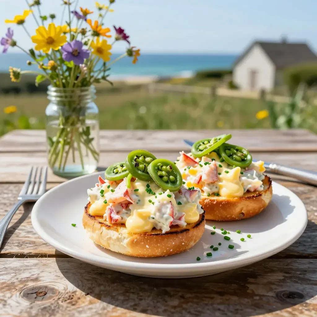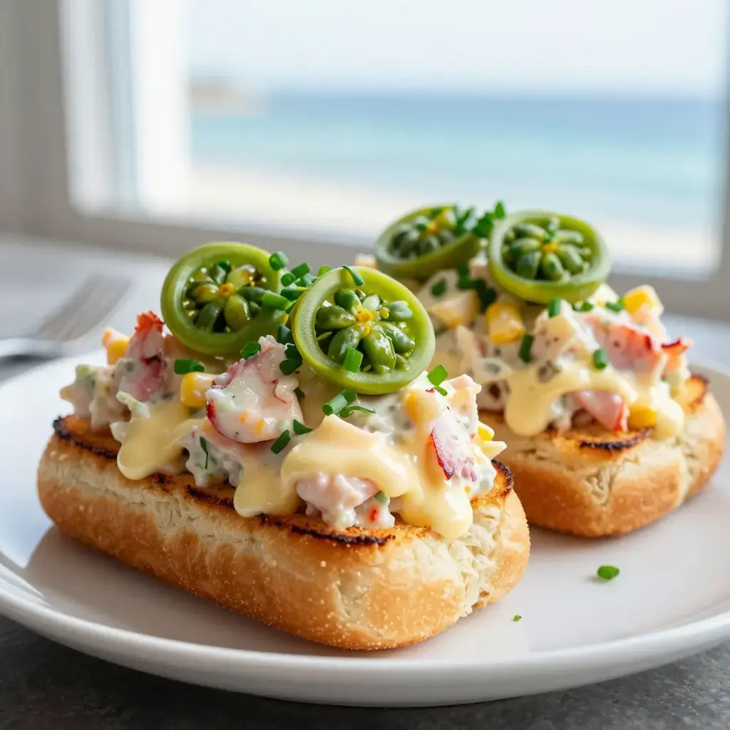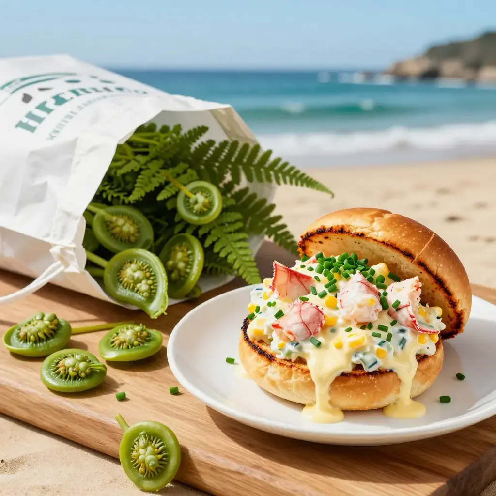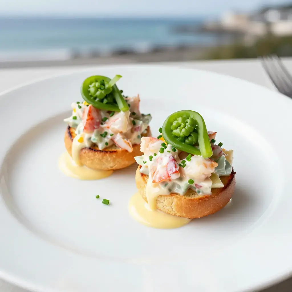 # Lobster Rolls with Pickled Fiddleheads and Corn Crema The classic Maine lobster roll is a perfect thing — but this modern-fusion riff builds on it with two other peak-season New England ingredients: fiddlehead ferns, the tightly coiled spring shoots harvested wild from riverside forests, and sweet summer corn turned into a silky crema. The result is a farm-to-coast plate that celebrates the region's fleeting growing season. Serves: 4 ## Ingredients ### Pickled Fiddleheads - 200g (7 oz) fresh fiddlehead ferns, cleaned and trimmed - 120ml (½ cup) white wine vinegar - 120ml (½ cup) water - 1 tbsp granulated sugar - 1 tsp fine sea salt - ½ tsp crushed red pepper flakes - 2 cloves garlic, thinly sliced ### Corn Crema - 3 ears fresh corn, kernels removed (about 360g / 2½ cups) - 2 tbsp unsalted butter - 1 shallot, minced - 120ml (½ cup) crème fraîche - 1 tbsp fresh lime juice - Salt and white pepper to taste ### Lobster and Assembly - 680g (1½ lb) cooked lobster meat, picked and roughly chopped (from about 2 x 700g / 1.5 lb live lobsters) - 3 tbsp best-quality mayonnaise - 1 tbsp fresh tarragon, finely chopped - 1 tsp fresh lemon juice - Salt and white pepper - 4 top-split hot dog buns - 30g (2 tbsp) unsalted butter, for toasting buns - Fresh chives, snipped, to garnish ## Instructions 1. Make the pickled fiddleheads (at least 1 hour ahead, up to 3 days): Blanch fiddleheads in boiling salted water 4 minutes, then shock in ice water and drain. Combine vinegar, water, sugar, salt, pepper flakes, and garlic in a small saucepan and bring to a boil. Pack fiddleheads into a jar and pour hot brine over them. Cool to room temperature, then refrigerate. 2. Make the corn crema: Melt butter in a skillet over medium heat. Add shallot and cook 3 minutes. Add corn kernels and cook until sweet and tender, 5–7 minutes. Transfer to a blender with crème fraîche and lime juice. Blend until smooth, then season with salt and white pepper. Strain through a fine mesh sieve for a silkier texture if desired. Keep warm. 3. Mix the lobster filling: Combine lobster meat, mayonnaise, tarragon, and lemon juice in a bowl. Season carefully with salt and white pepper. Refrigerate until ready to serve. 4. Toast buns: Melt butter in a skillet over medium-high heat and toast buns on both sides until golden, 1–2 minutes per side. 5. To assemble: Spoon a pool of corn crema into each toasted bun. Fill generously with lobster mixture. Top with 4–5 pickled fiddleheads and snipped chives. Serve immediately. **Cook's Notes:** Fiddleheads must always be blanched before eating — never serve them raw. The pickled fiddleheads can be made days ahead and improve with time. If fiddleheads are unavailable, pickled ramps or pickled green beans make excellent substitutes.Images