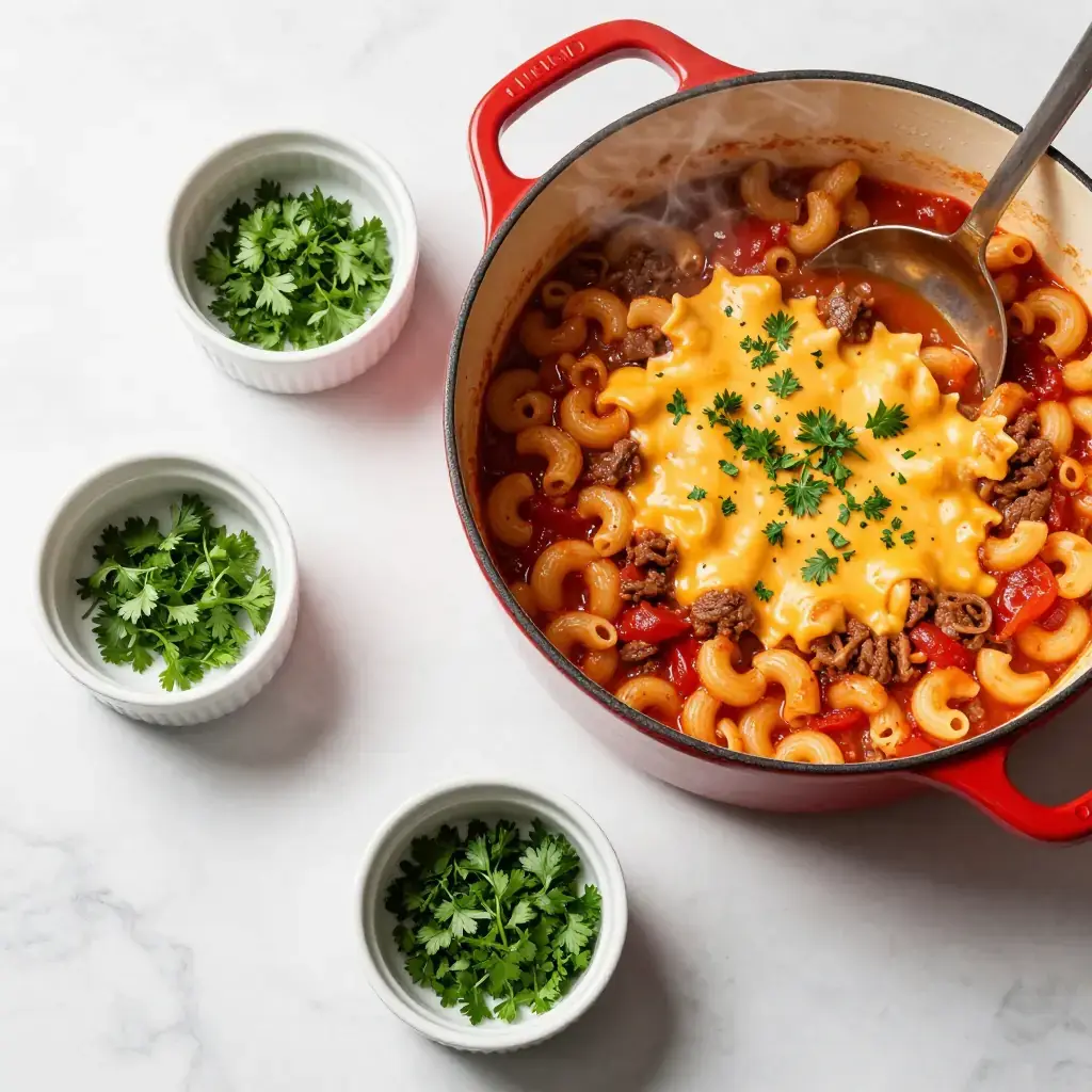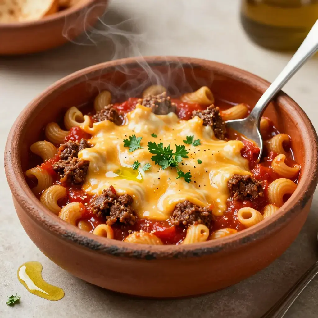 # American Goulash (Midwestern One-Pot) Not to be confused with its Hungarian namesake, American goulash is a Depression-era skillet supper that became a weeknight staple across the Midwest. Ground beef, tomatoes, and elbow macaroni cooked together in one pot — economical, filling, and endlessly comforting. Known in some families as "slumgullion" or "Johnny Marzetti" (an Ohio diner classic), it is the kind of dish that appears in every church cookbook from Ohio to South Dakota. Serves: 6 ## Ingredients - 700g (1 1/2 lb) lean ground beef - 1 large yellow onion, diced - 1 green bell pepper, diced - 4 cloves garlic, minced - 800g (28 oz) canned crushed tomatoes - 400g (14 oz) canned diced tomatoes - 480ml (2 cups) beef broth - 240ml (1 cup) water - 2 tbsp tomato paste - 1 tbsp Worcestershire sauce - 1 tsp smoked paprika - 1 tsp Italian seasoning - 1 tsp sugar - 1 tsp salt - 1/2 tsp black pepper - 300g (2 cups) dry elbow macaroni - 170g (1 1/2 cups) shredded cheddar or American cheese - 2 tbsp fresh parsley, chopped ## Instructions 1. In a large, deep skillet or Dutch oven over medium-high heat, brown ground beef, breaking it into small crumbles, for 6–8 minutes until no pink remains. Drain excess fat. 2. Add onion and green pepper; cook 4–5 minutes until softened. Add garlic and tomato paste; cook 1 minute, stirring constantly. 3. Add crushed tomatoes, diced tomatoes, broth, water, Worcestershire, paprika, Italian seasoning, sugar, salt, and pepper. Stir well and bring to a boil. 4. Stir in dry elbow macaroni. Reduce heat to medium-low, cover, and cook for 14–16 minutes, stirring every 4–5 minutes, until macaroni is tender and has absorbed most of the liquid. Add a splash of water if it gets too thick before the pasta is done. 5. Remove from heat. Scatter cheese over the top, cover, and let sit 3 minutes until melted. 6. Garnish with fresh parsley and serve directly from the pot. **Cook's Notes:** This is a one-pot dish in the truest sense — the pasta cooks right in the sauce, absorbing all the flavor. Do not overcook the pasta; pull it when it still has a slight chew, as it continues cooking with residual heat. Leftovers reheat beautifully with a splash of broth added.Images