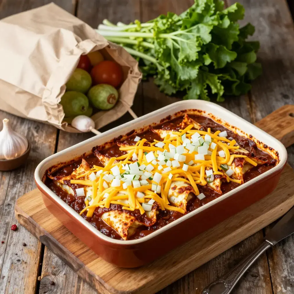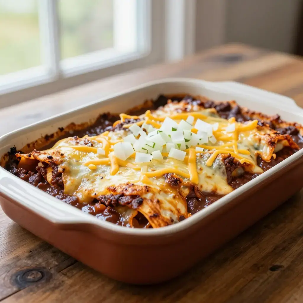 - Spread 1/2 cup (120ml) chile gravy across the bottom of a 23x33cm (9x13-inch) baking dish. Dip each softened tortilla in warm chile gravy, fill with 2 tbsp shredded cheddar and a pinch of onion, roll tightly, and place seam-side down in the dish.