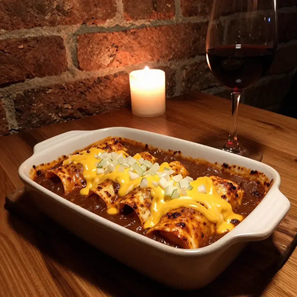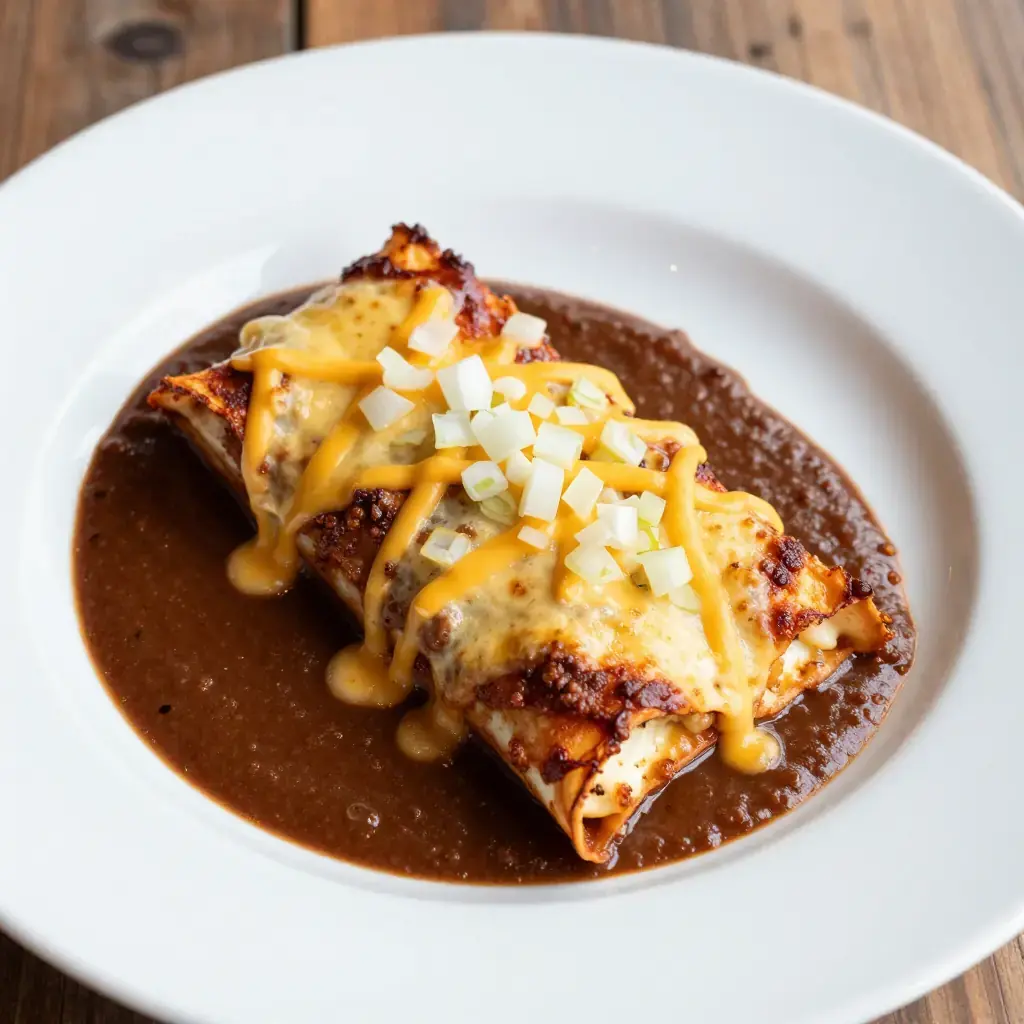 # Tex-Mex Cheese Enchiladas with Chile Gravy The hallmark of Tex-Mex cooking, these cheese enchiladas are smothered in a dark, earthy ancho chile gravy — not salsa, not mole, but the distinctly Texan chile con carne sauce that has graced diner plates since the early 1900s. Serves: 4 ## Ingredients **Chile Gravy:** - 3 tbsp (45ml) lard or vegetable oil - 3 tbsp (24g) all-purpose flour - 3 tbsp (21g) pure ancho chile powder (not chili seasoning blend) - 1 tsp (3g) cumin - 1/2 tsp (1.5g) garlic powder - 1/4 tsp (0.5g) dried oregano (Mexican) - 2 cups (480ml) beef broth - Salt to taste **Enchiladas:** - 12 corn tortillas (6-inch) - 340g (12 oz) yellow longhorn cheddar, shredded - 1/2 white onion, finely diced - 1/4 cup (60ml) vegetable oil (for softening tortillas) ## Instructions 1. Make the chile gravy: heat lard in a saucepan over medium heat. Whisk in flour and cook, stirring constantly, for 2 minutes until the roux turns light brown and smells nutty. 2. Add chile powder, cumin, garlic powder, and oregano. Stir for 30 seconds until fragrant. Slowly whisk in beef broth, a little at a time, until smooth. 3. Simmer over medium-low heat for 8-10 minutes, stirring occasionally, until the gravy is thick enough to coat the back of a spoon. Season with salt. Keep warm. 4. Preheat oven to 190°C (375°F). Heat oil in a small skillet over medium-high heat. Briefly fry each tortilla 5-8 seconds per side just until pliable, not crispy. Drain on paper towels. 5. Spread 1/2 cup (120ml) chile gravy across the bottom of a 23x33cm (9x13-inch) baking dish. Dip each softened tortilla in warm chile gravy, fill with 2 tbsp shredded cheddar and a pinch of onion, roll tightly, and place seam-side down in the dish. 6. Pour remaining chile gravy over the rolled enchiladas. Cover generously with remaining cheddar and the rest of the onion. 7. Bake uncovered for 20-25 minutes until cheese is bubbling and the edges of the tortillas are slightly crisped. **Cook's Notes:** Longhorn cheddar is traditional — its mild, creamy melt is part of the Tex-Mex identity. If unavailable, use mild yellow cheddar. The chile gravy can be made 3 days ahead and refrigerated. For a chili con carne version, stir 225g (8 oz) cooked ground beef into the gravy before baking.Images