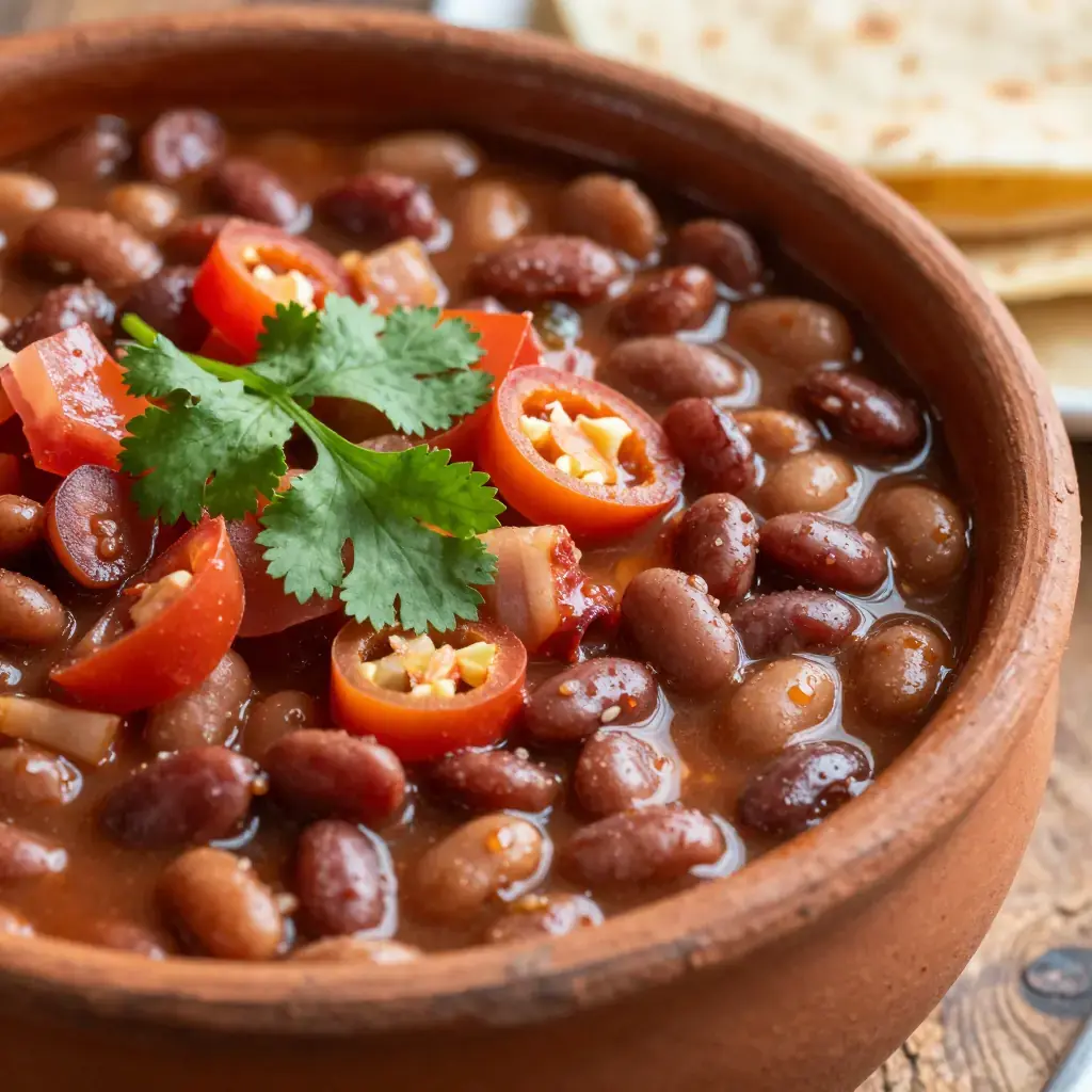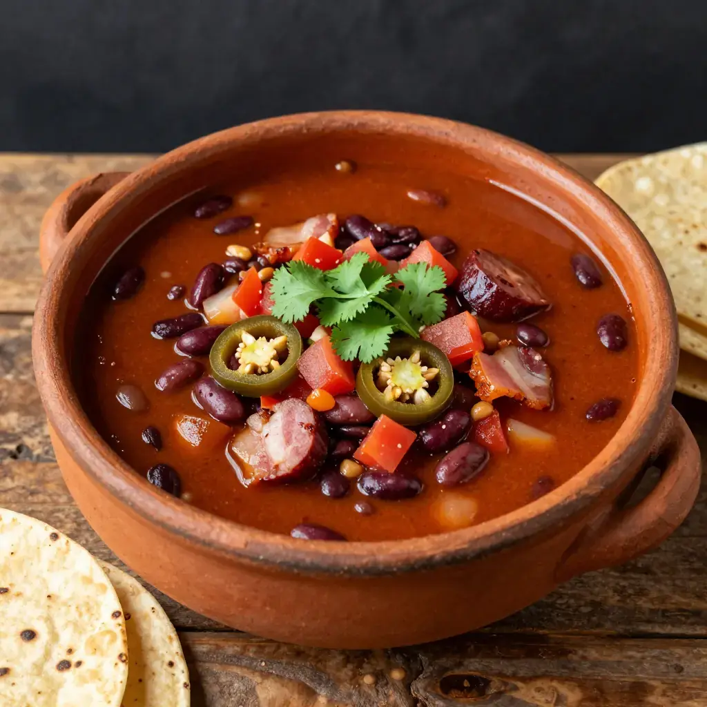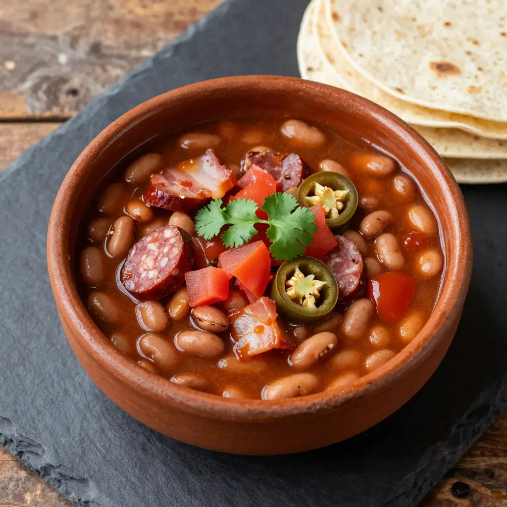 # Charro Beans (Frijoles Charros) Named after the Mexican charro cowboys, frijoles charros are the Tex-Mex answer to a one-pot meal: pinto beans slow-simmered with smoky bacon, Mexican chorizo, tomatoes, and chiles into a hearty, broth-rich stew. Found at every Texas barbecue and backyard cookout, they are as essential to the Lone Star table as the brisket itself. Serves: 8 ## Ingredients - 450g (1 lb) dried pinto beans, sorted and rinsed - 170g (6 oz) thick-cut bacon, cut into 12mm (1/2-inch) pieces - 170g (6 oz) Mexican chorizo, casing removed - 1 white onion, diced - 4 cloves garlic, minced - 2 Roma tomatoes, diced - 2 jalapeños, diced (seeds included for heat) - 1 serrano chile, sliced - 1 tsp (3g) cumin - 1 tsp (3g) chili powder - 2 sprigs fresh epazote (or 1 tbsp dried — substitute cilantro if unavailable) - 2.4L (10 cups) water or broth - Salt to taste - Fresh cilantro, for serving ## Instructions 1. Soak pinto beans overnight in cold water, or use the quick-soak method: cover with water in a large pot, boil for 2 minutes, remove from heat, and soak 1 hour. Drain and rinse. 2. In a large heavy pot or Dutch oven, cook bacon over medium heat for 5-6 minutes until the fat renders and the pieces begin to crisp. Add chorizo, breaking it up, and cook 4-5 minutes until browned. 3. Add onion and jalapeños; sauté 5 minutes until softened. Add garlic, tomatoes, serrano, cumin, and chili powder; cook 3 minutes more until the tomatoes soften. 4. Add drained beans, water or broth, and epazote. Bring to a boil, then reduce heat to a gentle simmer. 5. Cook uncovered for 2-2.5 hours, stirring occasionally, until beans are completely tender and the broth is flavorful and slightly thickened. Add water as needed to keep beans submerged during cooking. 6. Season generously with salt only after beans are fully tender (salt added too early prevents beans from softening properly). 7. Serve in deep bowls with the brothy liquid, topped with fresh cilantro. **Cook's Notes:** Charro beans are meant to be soupy — they are not refried beans. The ratio of broth to beans is part of what makes them satisfying as a meal or side. Leftover charro beans are traditionally mashed the next day to make frijoles a la charra, a creamy stovetop variation served with tortillas.Images