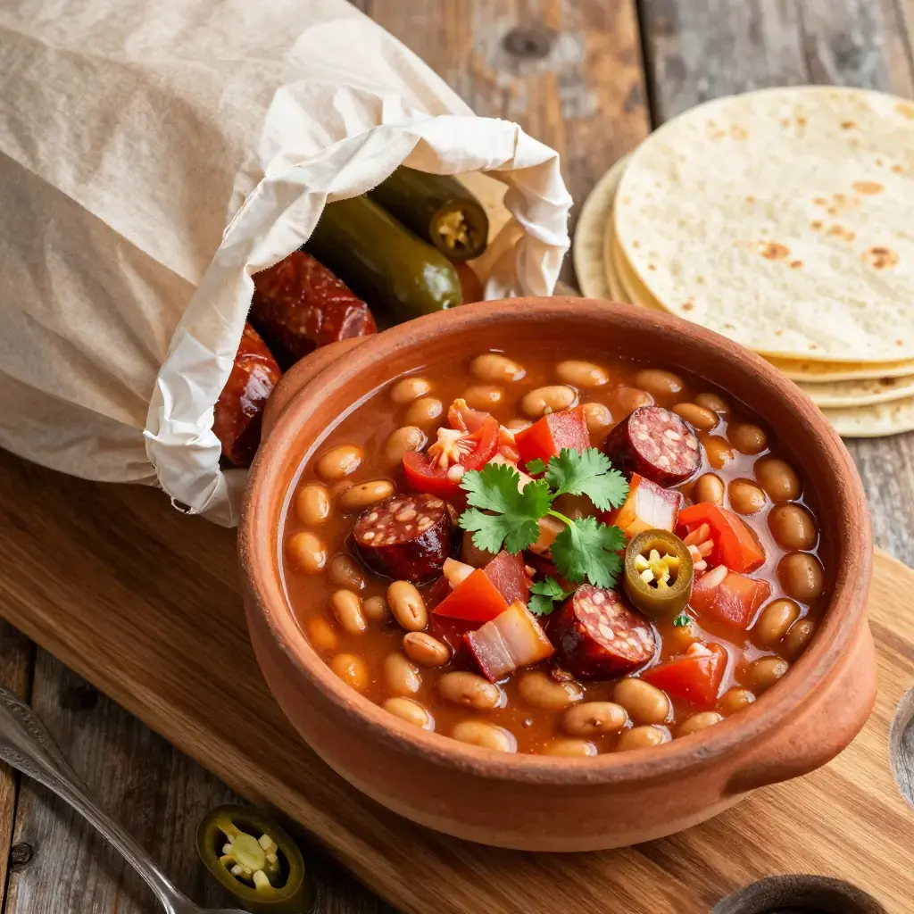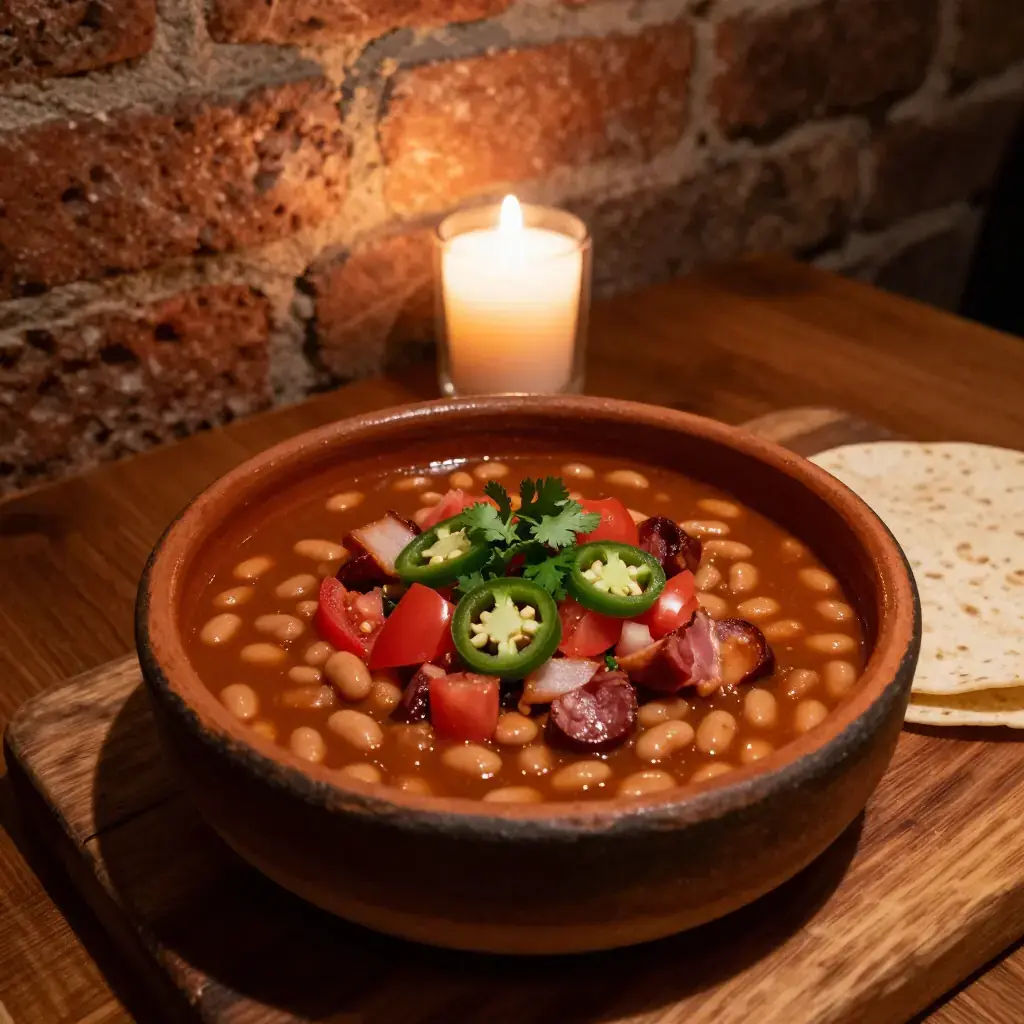 Named after the Mexican charro cowboys, frijoles charros are the Tex-Mex answer to a one-pot meal: pinto beans slow-simmered with smoky bacon, Mexican chorizo, tomatoes, and chiles into a hearty, broth-rich stew. Found at every Texas barbecue and backyard cookout, they are as essential to the Lone Star table as the brisket itself.