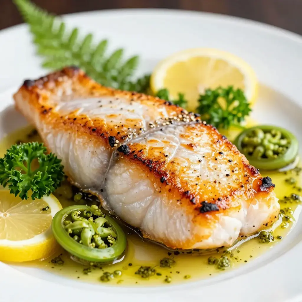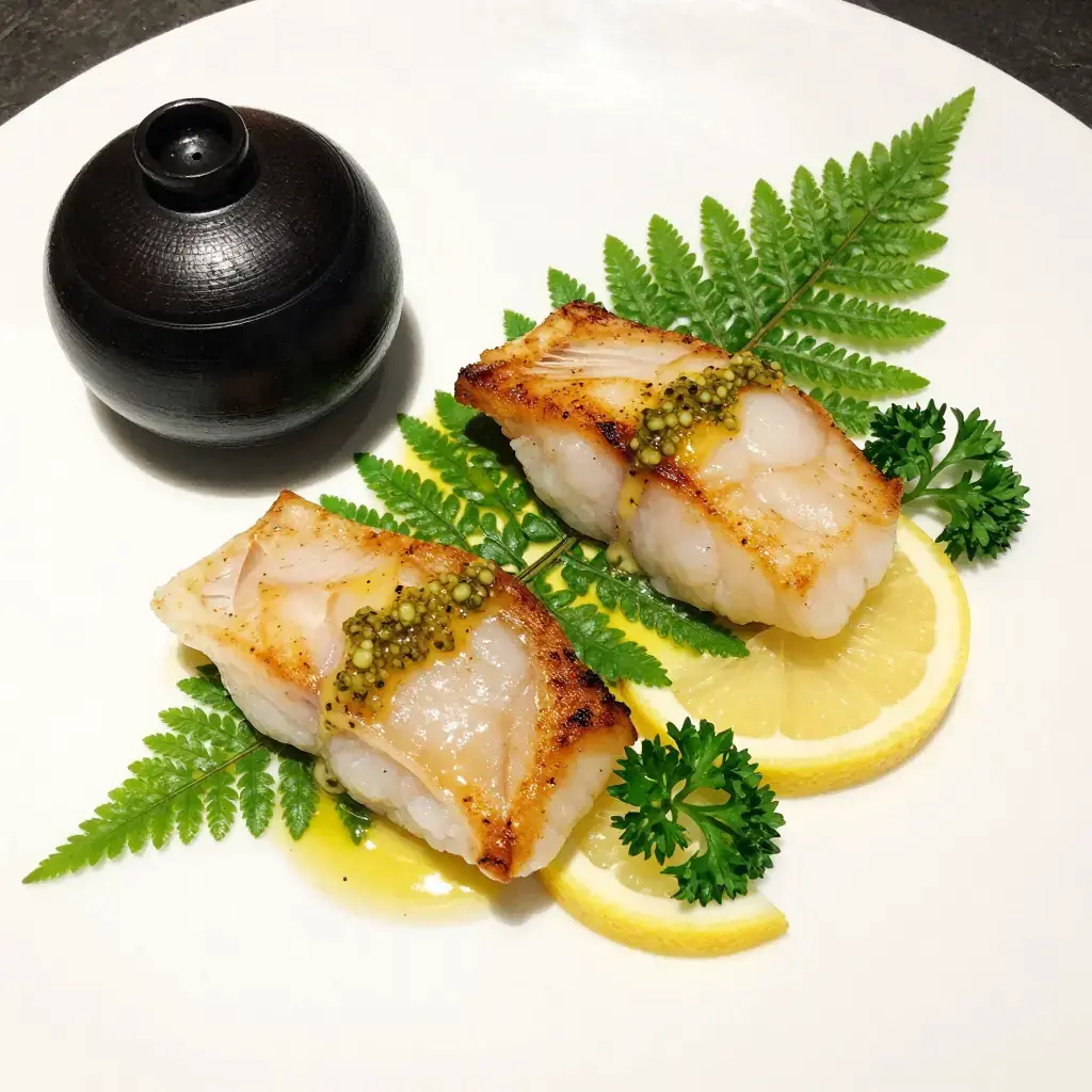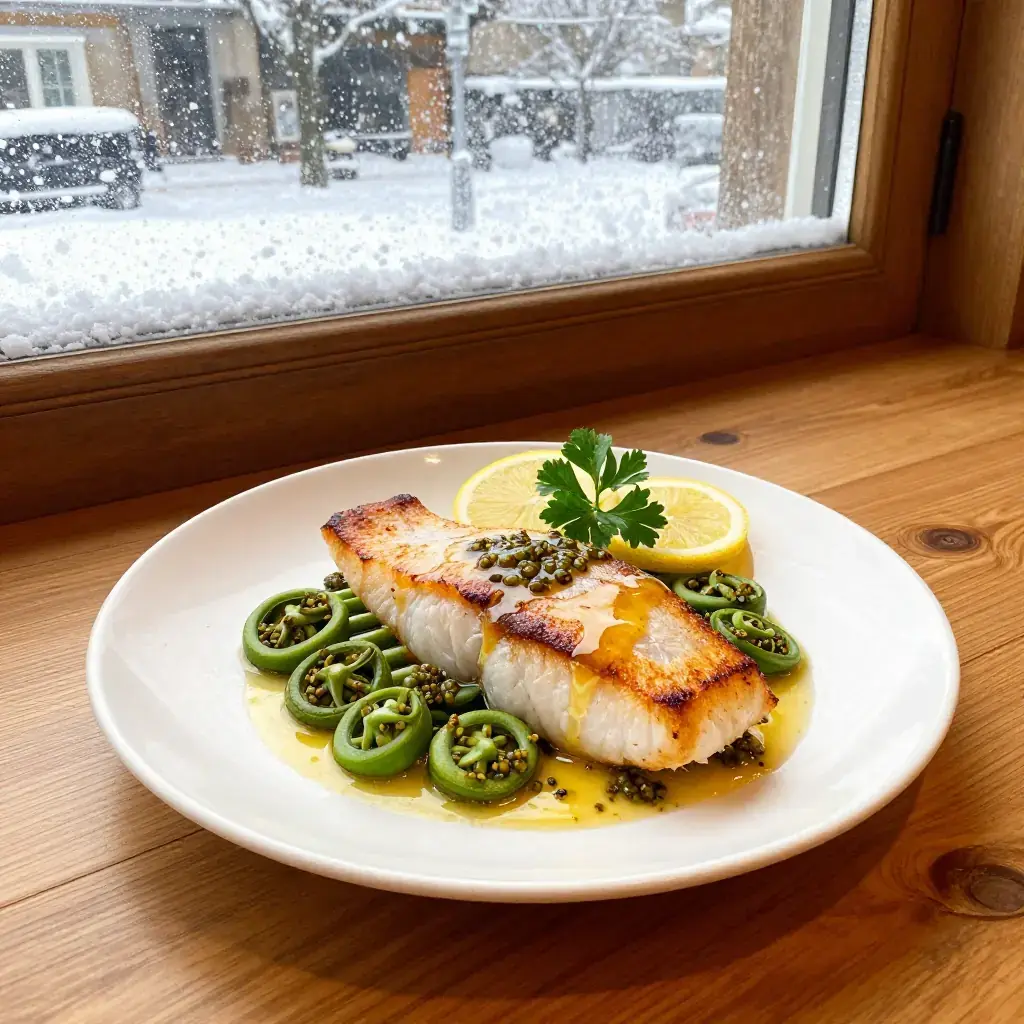 # Pan-Seared Halibut with Spring Fiddleheads and Lemon-Caper Butter Pacific halibut — harvested from Alaska to the Oregon coast — is the crown jewel of Northwest white fish: dense, sweet, and pristinely clean in flavor. Paired with fiddlehead ferns, which coil up through the damp forest floor each April and May, this dish distills the region's spring abundance into a dinner-party centerpiece that takes less than thirty minutes from start to plate. Serves: 4 ## Ingredients - 4 Pacific halibut fillets, 170-200g (6-7 oz) each, skin removed - 225g (8 oz) fresh fiddlehead ferns, trimmed and rinsed well - 4 tbsp (60g) unsalted butter, divided - 2 tbsp (30ml) olive oil - 4 garlic cloves, thinly sliced - 3 tbsp (27g) capers, drained - Zest and juice of 1 large lemon - 120ml (1/2 cup) dry white wine - 2 tbsp (10g) fresh flat-leaf parsley, chopped - 1 tsp (2g) fresh thyme leaves - Flaky sea salt and white pepper ## Instructions 1. Blanch fiddleheads in a large pot of well-salted boiling water for 2 minutes. Drain and transfer to a bowl of ice water. Drain again and pat dry. (Blanching is essential to neutralize any bitterness and break down enzymes.) 2. Pat halibut fillets very dry with paper towels. Season generously on both sides with flaky salt and white pepper. 3. Heat 1 tbsp butter and the olive oil in a large heavy skillet over medium-high heat until butter foams. Add halibut and sear undisturbed 3-4 minutes until golden. Flip carefully and cook 2-3 minutes more until just opaque throughout. Transfer to a warm plate and tent loosely with foil. 4. In the same pan over medium heat, melt 1 tbsp butter. Add fiddleheads and toss until heated through and lightly colored, 2-3 minutes. Season with salt and transfer alongside the fish. 5. Add remaining 2 tbsp butter to the pan. Add garlic and cook 30 seconds until just fragrant. Add capers and cook 1 minute. Pour in white wine and let bubble 1 minute. Add lemon zest, lemon juice, parsley, and thyme. Swirl the pan to emulsify. 6. Spoon the lemon-caper butter over the halibut and fiddleheads. Serve immediately. **Cook's Notes:** Never eat raw fiddleheads — always blanch them first. Buy halibut the day of cooking and keep it very cold; even a few hours of warmth dulls the flavor. A squeeze of additional lemon at the table is always welcome.Images