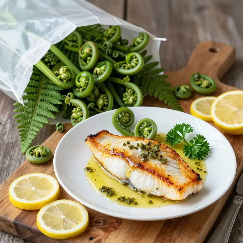 Pacific halibut — harvested from Alaska to the Oregon coast — is the crown jewel of Northwest white fish: dense, sweet, and pristinely clean in flavor. Paired with fiddlehead ferns, which coil up through the damp forest floor each April and May, this dish distills the region's spring abundance into a dinner-party centerpiece that takes less than thirty minutes from start to plate.