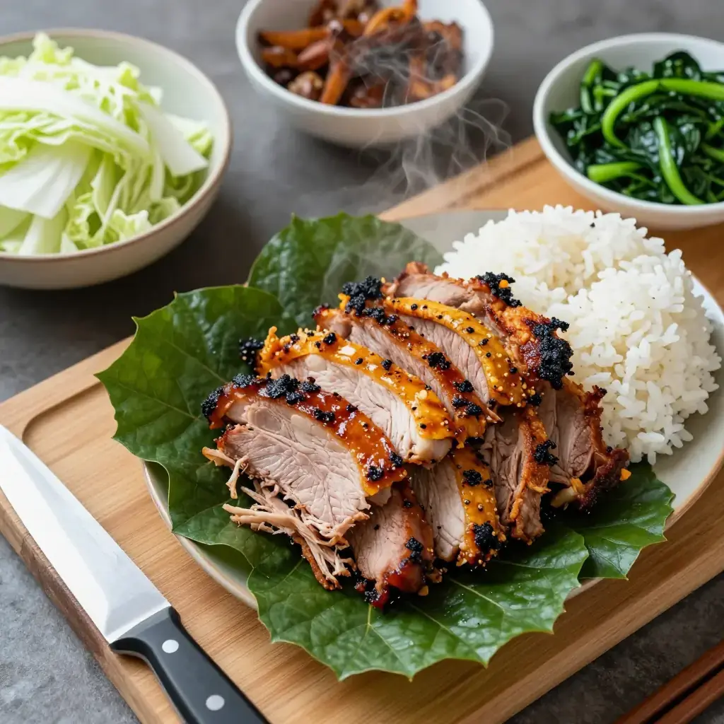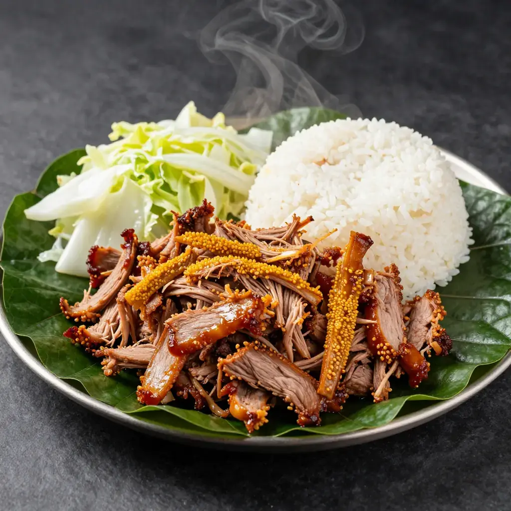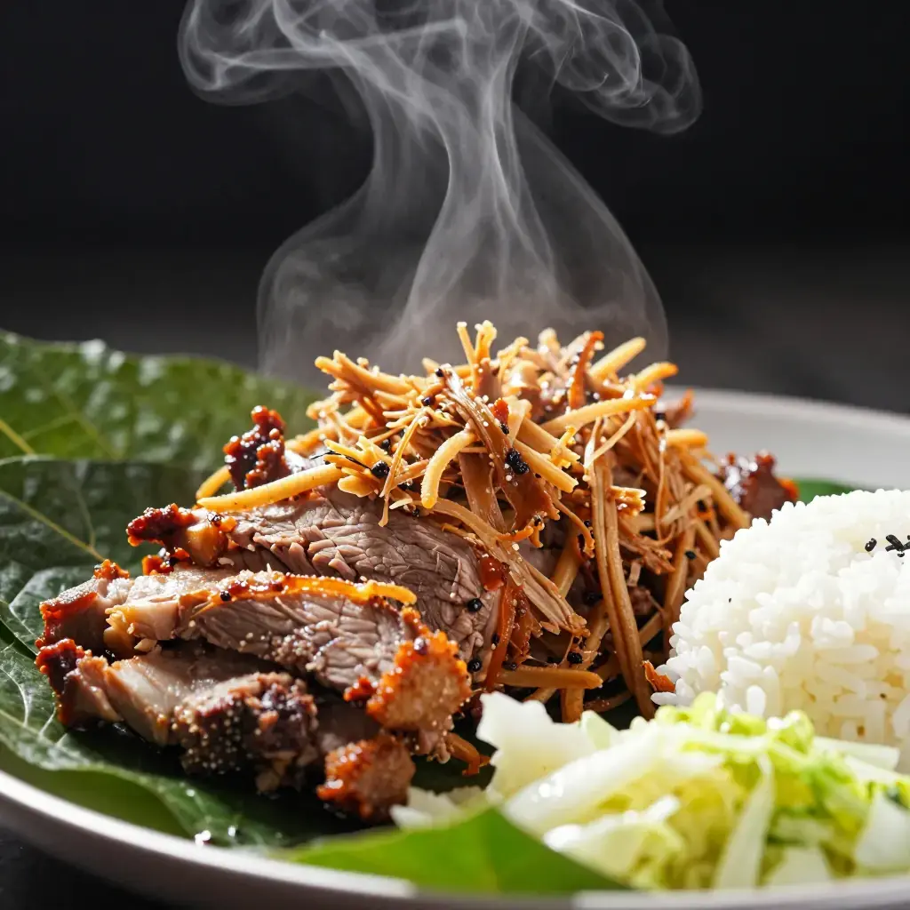 Kalua pork is the centerpiece of every Hawaiian luau, traditionally cooked whole in an underground imu oven lined with banana leaves and volcanic rocks for 8-12 hours. This slow-cooker version captures the smoky, pull-apart tenderness at home using liquid smoke and ti or banana leaves for that unmistakable earthy sweetness.