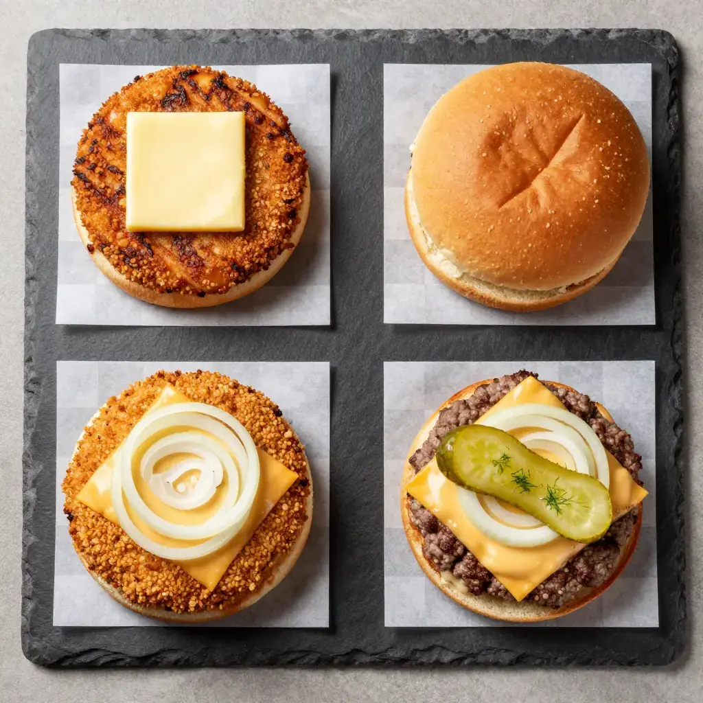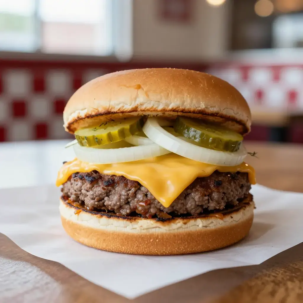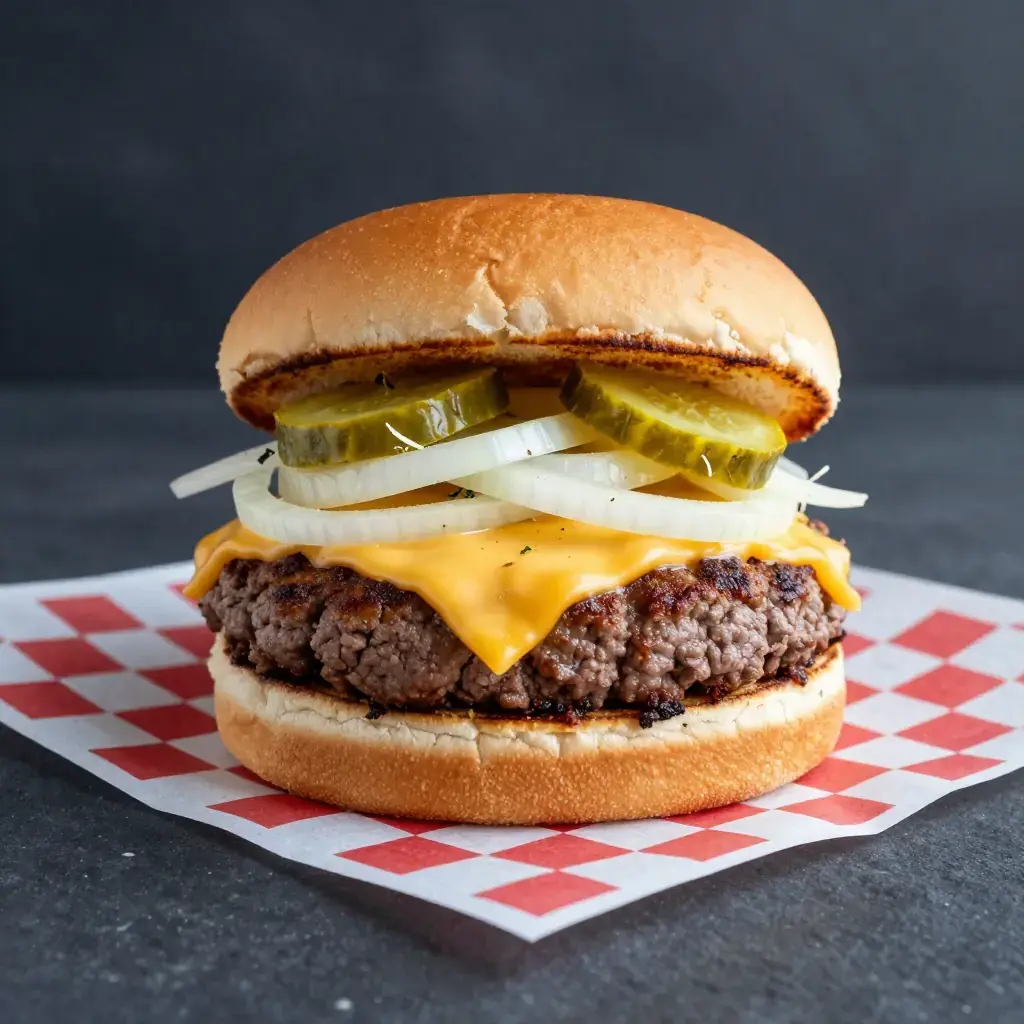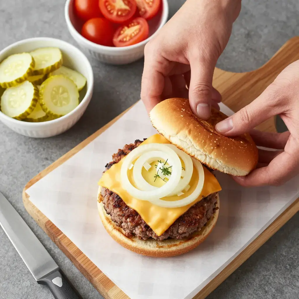 - Assemble immediately: place patty on the bun bottom, add mustard, onion, pickles, and any other toppings. Serve immediately — the butter cooling is part of the experience.
