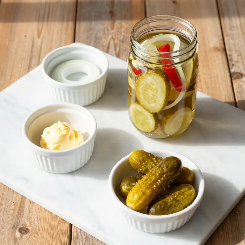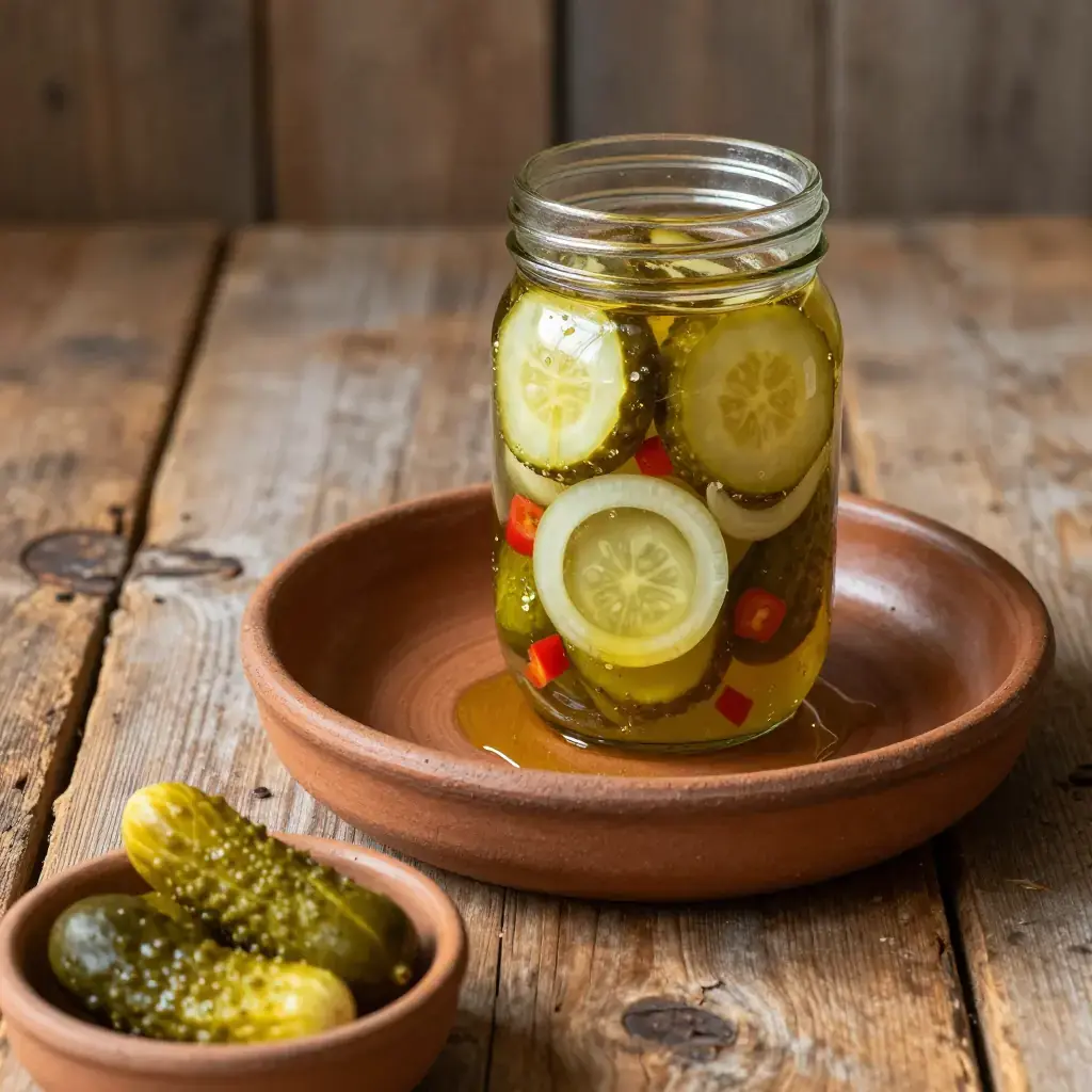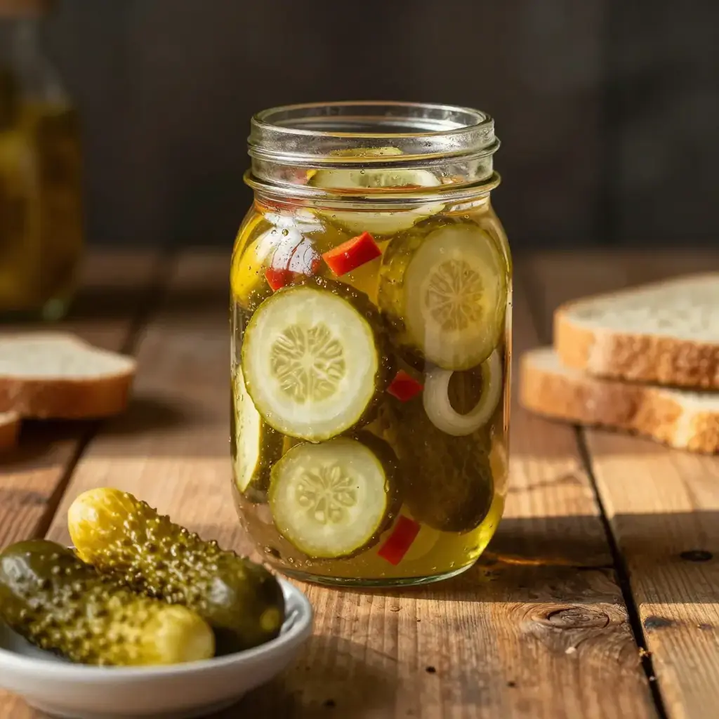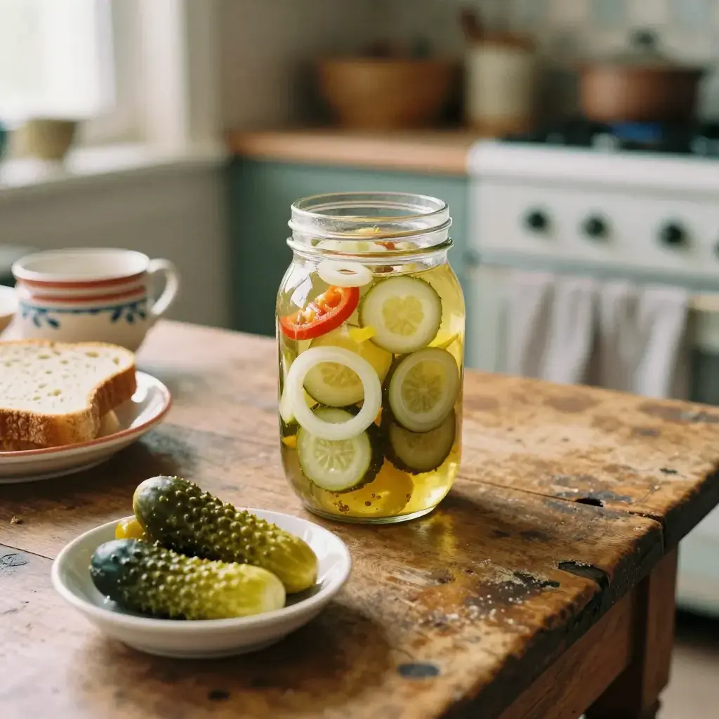 Pickling has been a cornerstone of New England food preservation since the colonial era, when long winters made the summer garden's bounty last through January. This sweet-and-sour bread and butter brine — bright with cider vinegar and a hint of celery seed — was a farmhouse staple across Vermont, Maine, and New Hampshire, appearing on every supper table as a condiment and side.