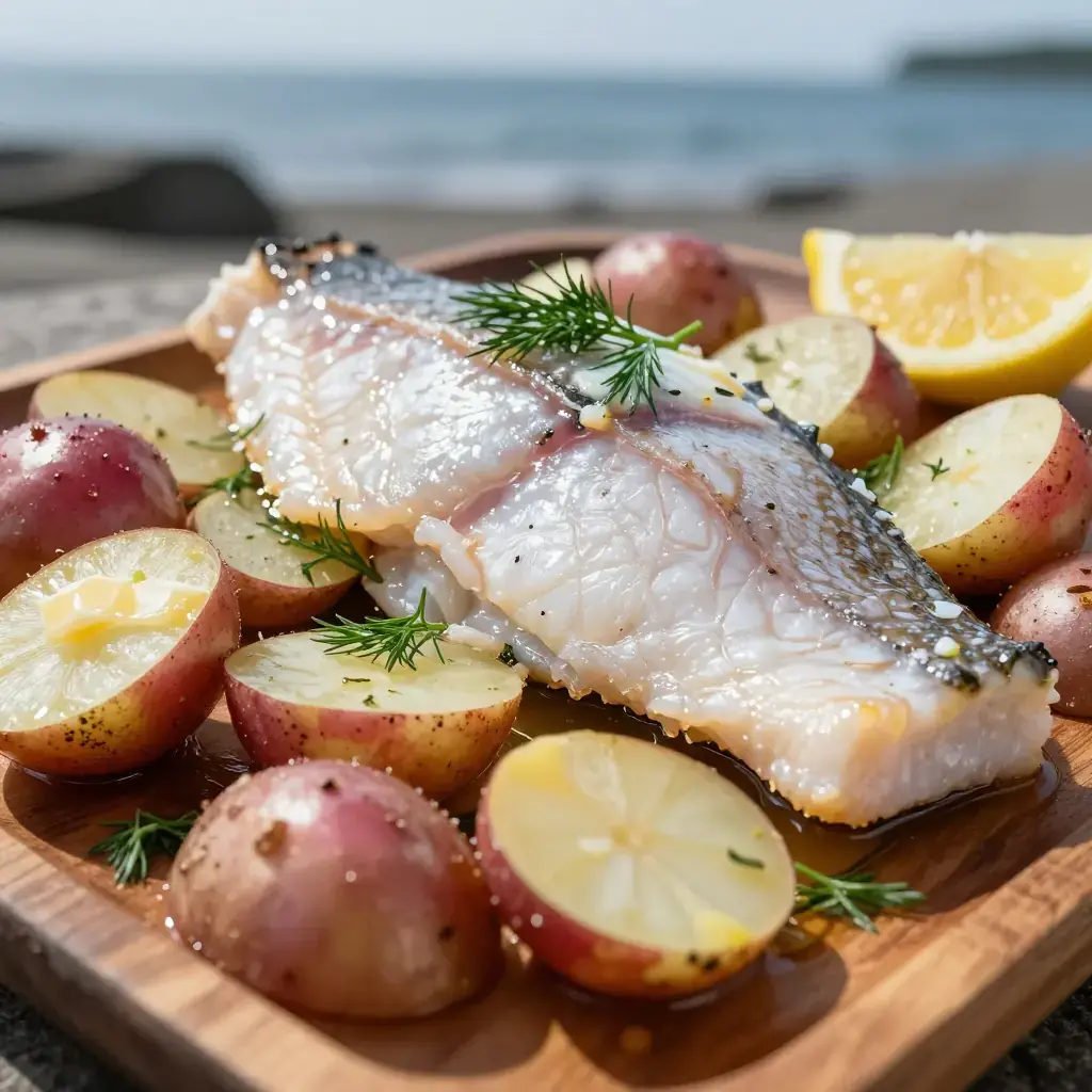 - Arrange whitefish, potatoes, and onions on a large platter. Drizzle generously with melted butter and shower with fresh dill.
