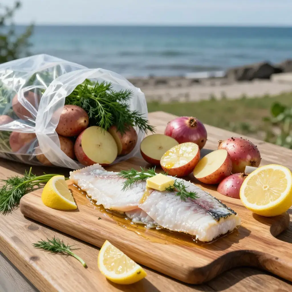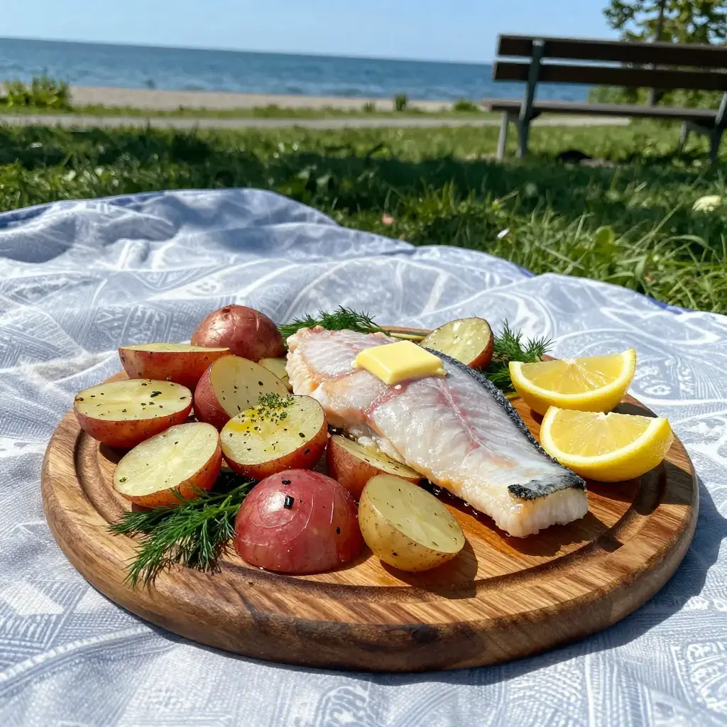 # Door County Fish Boil The fish boil is the defining culinary ritual of Wisconsin's Door County peninsula, brought by Scandinavian fishermen in the late 1800s and carried on today at lakeside restaurants where the dramatic finale — the 'boilover' — draws crowds every evening. A kerosene-fueled fire is doused with fuel at the last moment to cause the pot to boil over violently, sending fish oils and impurities cascading away, leaving pure, clean-tasting whitefish behind. Serves: 6 ## Ingredients - 1.4kg (3 lbs) Lake Superior whitefish steaks, skin on, cut 4cm (1.5 in) thick - 900g (2 lbs) small red potatoes, halved - 3 medium yellow onions, quartered - 110g (1/2 cup) kosher salt, plus more for the fish - 4 litres (1 gallon) water - 2 bay leaves - 1 tbsp whole black peppercorns ### For Serving - 115g (1/2 cup) unsalted butter, melted - Lemon wedges - Fresh dill - Dark rye bread - Cherry pie (traditional Door County accompaniment) ## Instructions 1. Bring water to a rolling boil in a very large stockpot (at least 12-litre capacity) over high heat. Add salt, bay leaves, and peppercorns. 2. Add potatoes and onions. Boil uncovered for 18-20 minutes until potatoes are nearly tender when pierced. 3. Season whitefish steaks generously with salt on both sides. Lower into the boiling pot. 4. Boil vigorously for 10-12 minutes. The fish is done when it flakes easily and the flesh at the bone turns opaque. 5. Drain carefully using a large spider or slotted spoon — traditionally the pot is tipped to drain on a sloped outdoor fire stand. 6. Arrange whitefish, potatoes, and onions on a large platter. Drizzle generously with melted butter and shower with fresh dill. 7. Serve immediately with lemon wedges, dark rye bread, and the obligatory Door County cherry pie for dessert. **Cook's Notes:** The salt quantity seems alarming but is correct — the fish only boils briefly and doesn't absorb as much as you'd expect. If Lake Superior whitefish is unavailable, substitute fresh lake trout or Pacific cod. The vigorous boil is essential: a gentle simmer produces mushy, waterlogged fish.Images