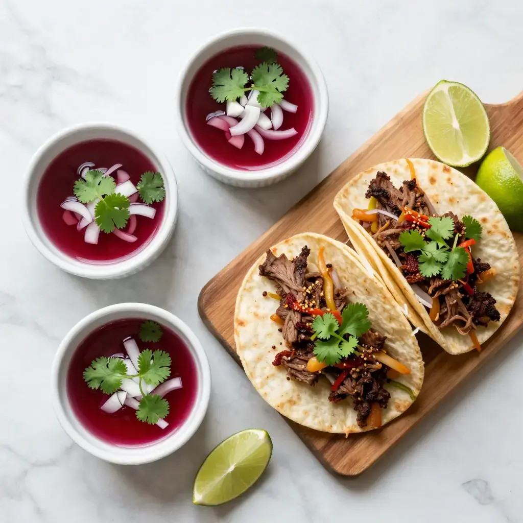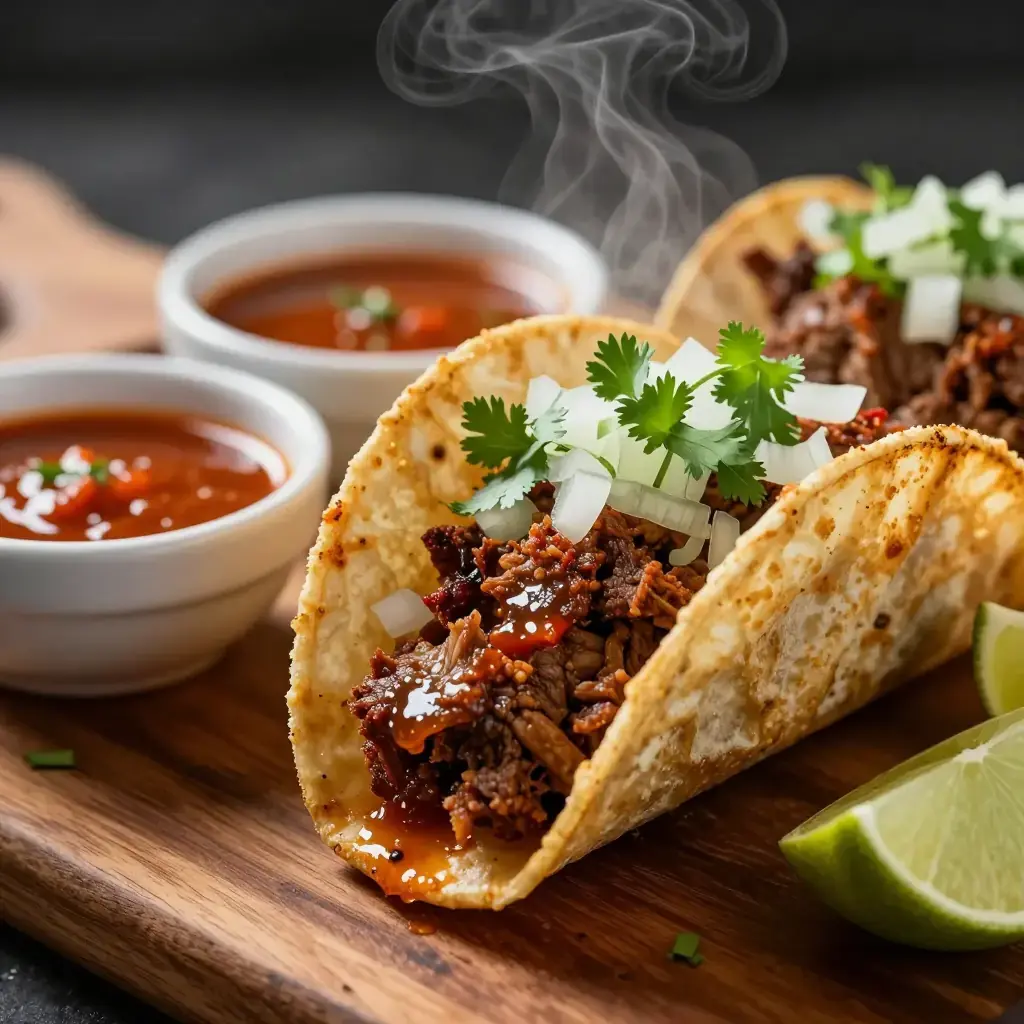 Birria-style beef has become a cornerstone of Tex-Mex street culture — chuck roast braised low and slow in dried chiles, tomatoes, and warm spices, then piled into corn tortillas dipped in the vivid consommé and crisped on a griddle.