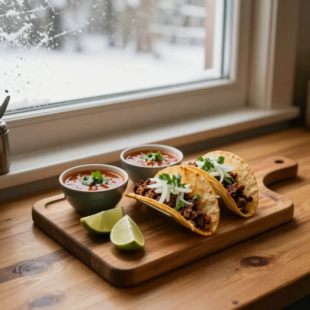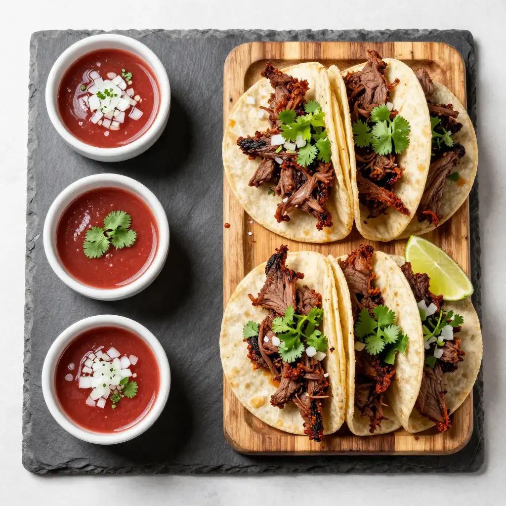 # Tex-Mex Birria-Style Braised Beef Tacos Birria-style beef has become a cornerstone of Tex-Mex street culture — chuck roast braised low and slow in dried chiles, tomatoes, and warm spices, then piled into corn tortillas dipped in the vivid consommé and crisped on a griddle. Serves: 6 ## Ingredients - 1.5 kg (3.3 lb) beef chuck roast, cut into large chunks - 4 dried guajillo chiles, stemmed and seeded - 2 dried ancho chiles, stemmed and seeded - 1 chipotle chile in adobo plus 1 tbsp (15 ml) sauce - 4 Roma tomatoes, halved - 1 white onion, quartered - 6 garlic cloves - 1 tsp (5 ml) ground cumin - 1 tsp (5 ml) dried oregano - 1/2 tsp (2.5 ml) ground cinnamon - 1/4 tsp (1.25 ml) ground cloves - 2 tbsp (30 ml) apple cider vinegar - 500 ml (2 cups) beef stock - Salt and black pepper to taste - 18 corn tortillas - 200 g (7 oz) Oaxacan or mozzarella cheese, shredded - Chopped white onion, fresh cilantro, and lime wedges to serve ## Instructions 1. Toast dried chiles in a dry skillet over medium heat for 1–2 minutes until fragrant. Transfer to a bowl and cover with boiling water; soak 15 minutes until softened. 2. Blend soaked chiles with chipotle, tomatoes, onion, garlic, cumin, oregano, cinnamon, cloves, vinegar, and 250 ml (1 cup) of the beef stock until smooth. 3. Season chuck roast generously with salt and pepper. Place in a slow cooker and pour blended chile sauce over the top. Add remaining stock. 4. Cook on LOW for 8–9 hours or HIGH for 4–5 hours until beef is fall-apart tender. Skim fat from surface and reserve braising liquid (consommé) in a bowl. 5. Shred beef with two forks, mixing it back into the thickened sauce. 6. Heat a griddle or cast-iron skillet over medium-high. Dip tortillas briefly in consommé, lay on griddle, add cheese and shredded beef, fold, and cook 2–3 minutes per side until crispy and melted. 7. Serve immediately with chopped onion, cilantro, lime wedges, and small cups of consommé for dipping. **Cook's Notes:** The consommé is half the experience — don't skip dipping the tortillas before crisping. Leftover braised beef freezes for up to 3 months.Images