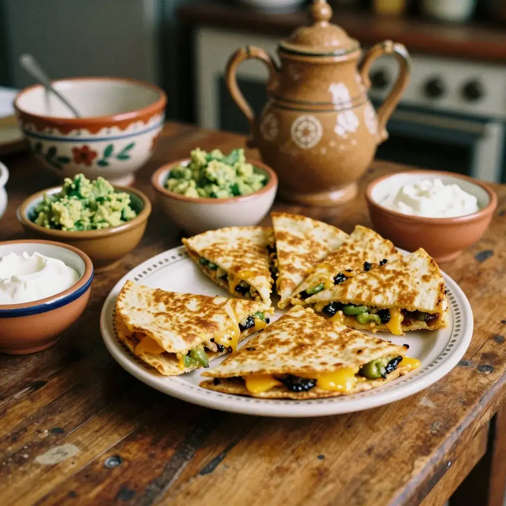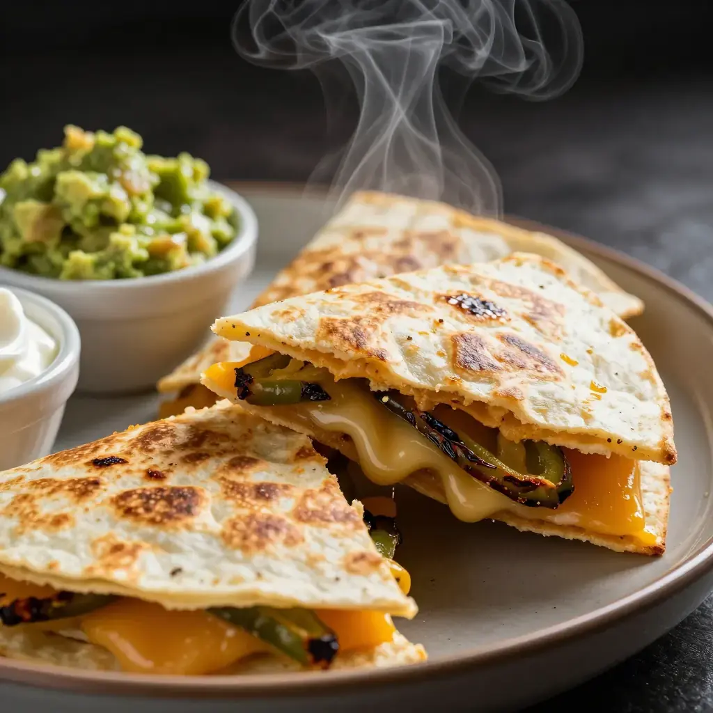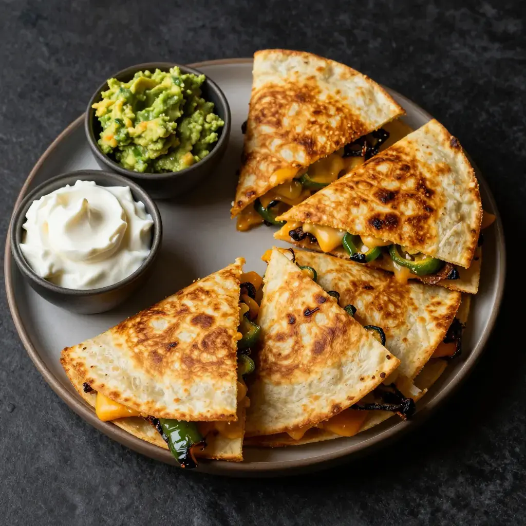 # Roasted Poblano and Cheese Quesadillas Blackened poblano chiles with melted Oaxacan and cheddar cheese between a crisped flour tortilla is a Tex-Mex vegetarian staple that proves simple ingredients, treated right, are all you need for a satisfying meal. Serves: 4 ## Ingredients - 4 poblano chiles - 8 large flour tortillas (25 cm / 10-inch) - 250 g (9 oz) Oaxacan cheese (or mozzarella), shredded - 150 g (5 oz) sharp cheddar, shredded - 1 white onion, thinly sliced - 2 tbsp (30 ml) butter or vegetable oil - 1/2 tsp (2.5 ml) garlic powder - Salt to taste ### To Serve - Guacamole - Sour cream or Mexican crema - Pico de gallo or fresh salsa ## Instructions 1. Roast poblanos directly over a gas flame or under the broiler, turning with tongs every 2 minutes, until completely charred all over, about 8–10 minutes. Place in a sealed plastic bag or covered bowl for 10 minutes to steam. 2. Peel off charred skin under cold running water. Stem, seed, and slice poblanos into 5mm (1/4-inch) strips (rajas). Set aside. 3. Melt 1 tbsp (15 ml) butter in a wide skillet over medium heat. Add sliced onion with garlic powder and a pinch of salt. Cook stirring occasionally 12–15 minutes until golden and caramelized. Combine with poblano strips. 4. Heat a large skillet or griddle over medium-high. Brush lightly with butter. 5. Place one tortilla in skillet. Sprinkle half the tortilla with a mix of Oaxacan and cheddar cheeses, then add a generous spoonful of the poblano-onion mixture. Fold tortilla in half. 6. Cook 2–3 minutes per side until golden and crispy and cheese is fully melted. Repeat with remaining tortillas. 7. Slice each quesadilla into three wedges and serve immediately with guacamole, crema, and pico de gallo. **Cook's Notes:** Roasting the poblanos until fully blackened — not just spotted — makes peeling much easier and gives a sweeter, smokier flavor. Pre-shredded cheese contains anti-caking agents that impede melting; shred your own for best results.Images