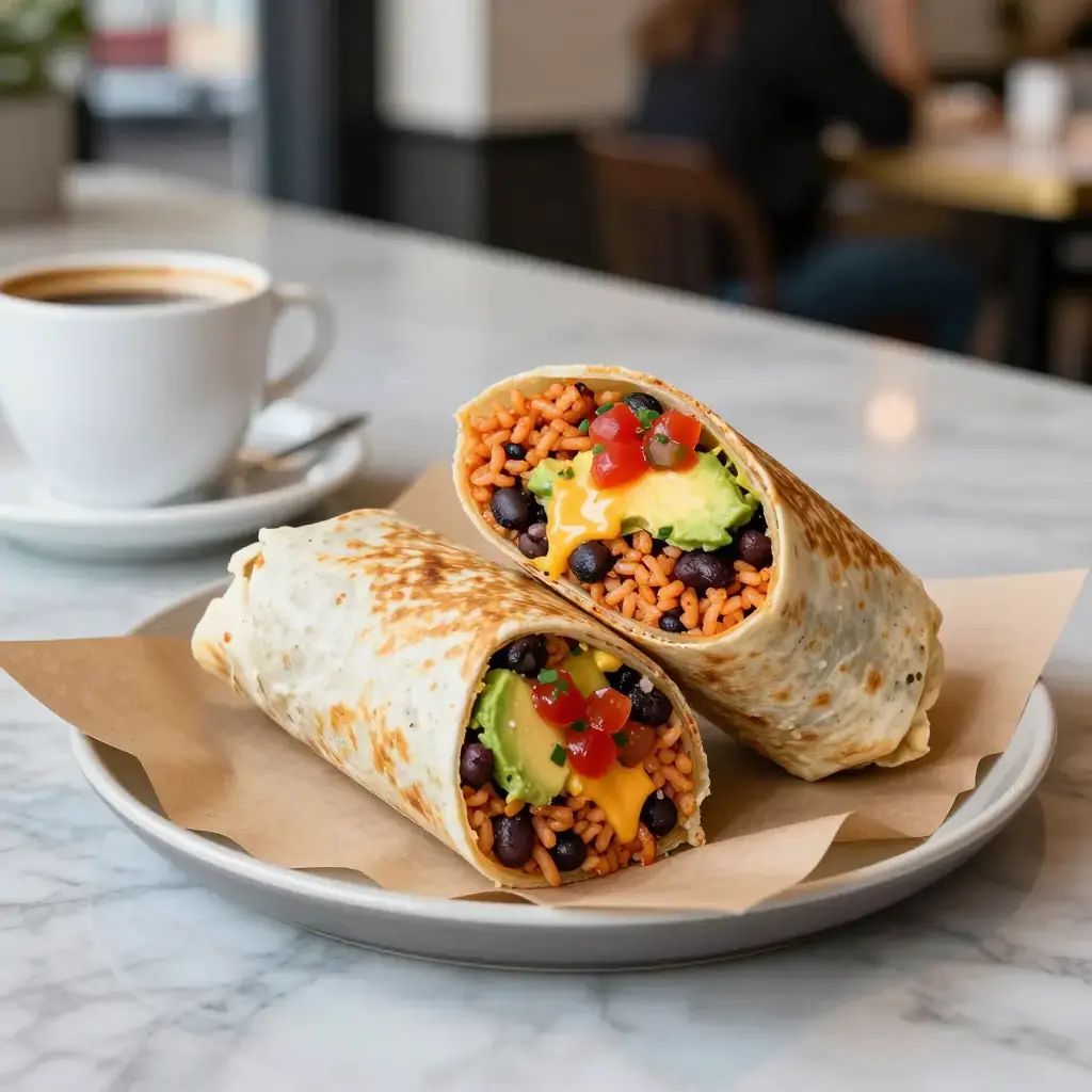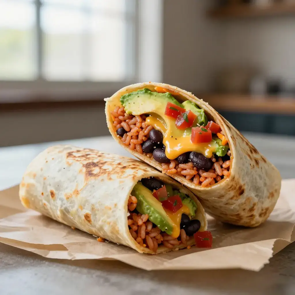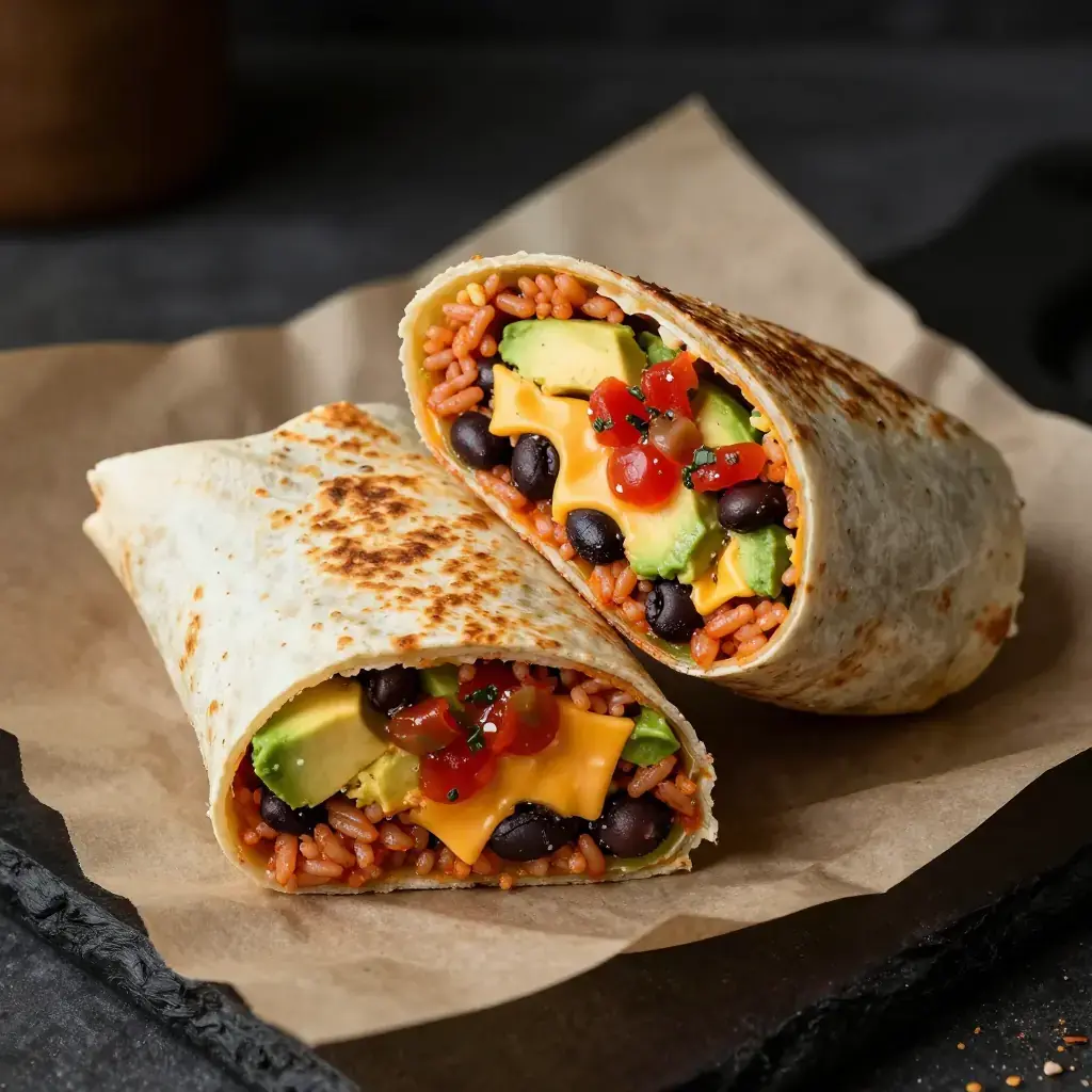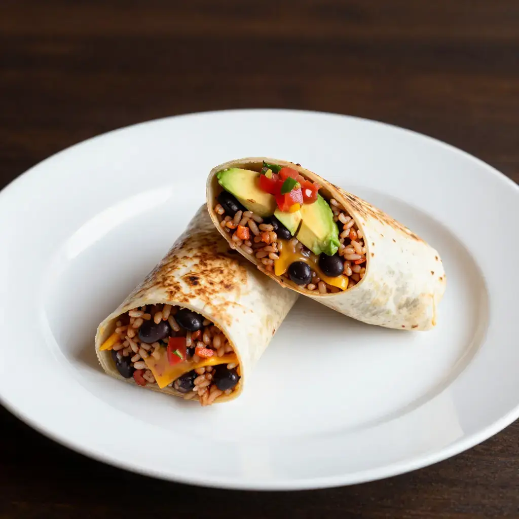 # Tex-Mex Rice and Black Bean Burrito The fully loaded Tex-Mex burrito is a satisfying all-in-one meal: seasoned rice, creamy black beans, roasted peppers, cheese, and salsa wrapped in a warm flour tortilla. It's a vegetarian workhorse that's as welcome at lunch as it is after a long day. Serves: 4 ## Ingredients ### Tex-Mex Rice - 1 tbsp (15 ml) vegetable oil - 200 g (1 cup) long-grain white rice, rinsed - 1/2 white onion, finely diced - 2 garlic cloves, minced - 1 tsp (5 ml) ground cumin - 1/2 tsp (2.5 ml) smoked paprika - 400 g (14 oz) canned diced tomatoes with juices - 240 ml (1 cup) vegetable stock - Salt to taste ### Black Beans - 2 cans (800 g / 28 oz total) black beans, drained and rinsed - 1/2 tsp (2.5 ml) ground cumin - 1/4 tsp (1.25 ml) chili powder - Juice of 1 lime ### Burrito Assembly - 4 large flour tortillas (30 cm / 12-inch), warmed - 150 g (5 oz) sharp cheddar or Monterey Jack, shredded - 1 red bell pepper, roasted and sliced - 120 ml (1/2 cup) sour cream - 120 ml (1/2 cup) salsa roja - 1 avocado, sliced - Fresh cilantro to taste ## Instructions 1. Make rice: heat oil in a medium saucepan over medium-high. Add rice and toast stirring 2–3 minutes until light golden. Add onion and cook 2 minutes until softened. Add garlic, cumin, and paprika; stir 30 seconds. 2. Pour in diced tomatoes and vegetable stock. Season with salt. Bring to a boil, reduce heat to low, cover, and cook 18 minutes. Let steam off heat 5 minutes. Fluff with a fork. 3. Warm black beans in a small saucepan over medium heat with cumin, chili powder, lime juice, and a pinch of salt. Cook stirring 5 minutes until fragrant and hot. 4. Warm tortillas in a dry skillet or directly over a gas flame for 15–20 seconds per side. 5. To build each burrito: lay tortilla flat, add a scoop of rice just below center, then black beans, shredded cheese, roasted pepper strips, a spoonful of sour cream, salsa, avocado, and cilantro. 6. Fold in the sides of the tortilla, then roll away from you tightly. Slice diagonally if serving immediately. Toast briefly in a skillet seam-side down to seal, if desired. **Cook's Notes:** Toasted rice (step 1) is the secret to restaurant-quality Tex-Mex rice — never skip it. Burritos can be made ahead, wrapped tightly in foil, and reheated in a 180°C (350°F) oven for 15 minutes.Images