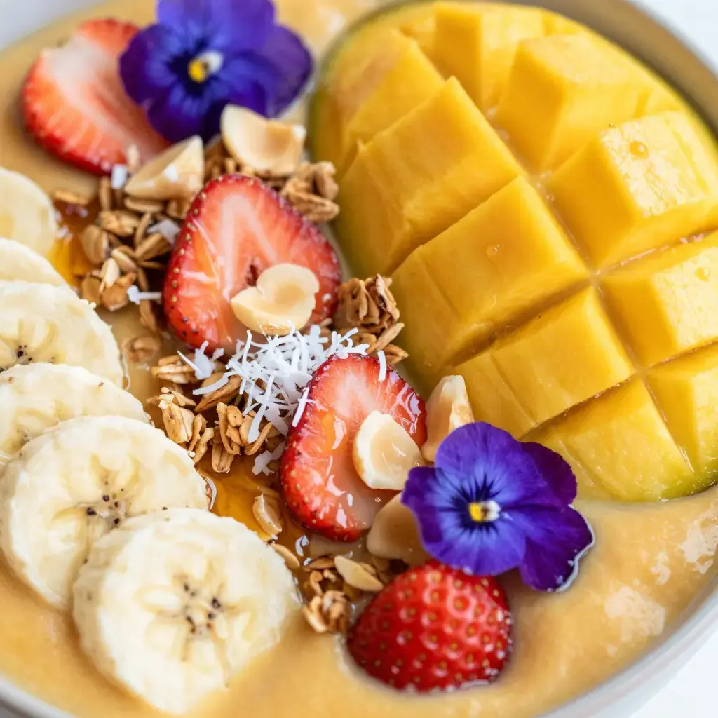 - Arrange toppings in sections over each bowl: fresh mango, strawberries, and banana slices on one side; granola, toasted coconut, and macadamia nuts on the other.