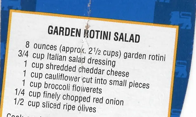Garden Rotini Salad 8 ounces, approximately 2 1/2 cups, of garden rotini. 3/4 cup Italian salad dressing. 1 cup of shredded cheddar cheese. 1 cup of cauliflower, cut into small pieces. 1 cup of broccoli florets. 1/4 cup finely chopped red onion. 1/2 cup sliced ripe olives. 1 bowl of garden rotini, as directed, then drain. In large bowl, combine all ingredients, cover and refrigerate, stir gently before serving. Serves 6.llm