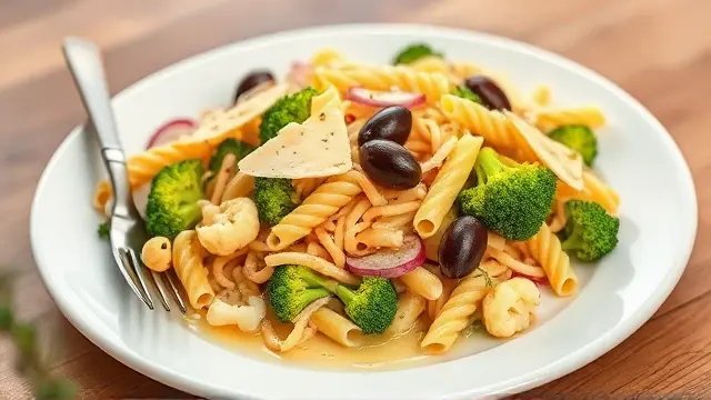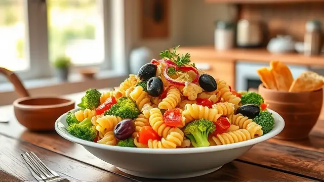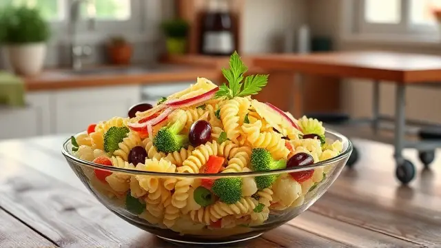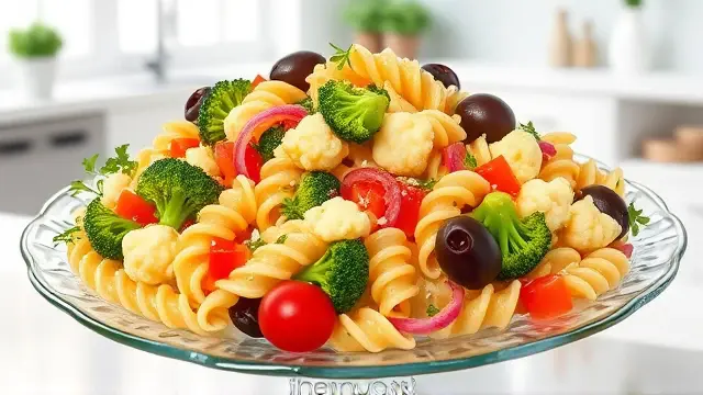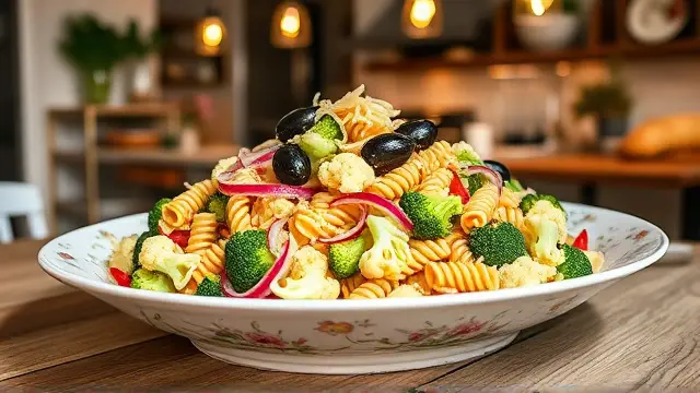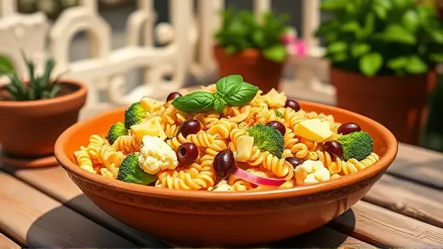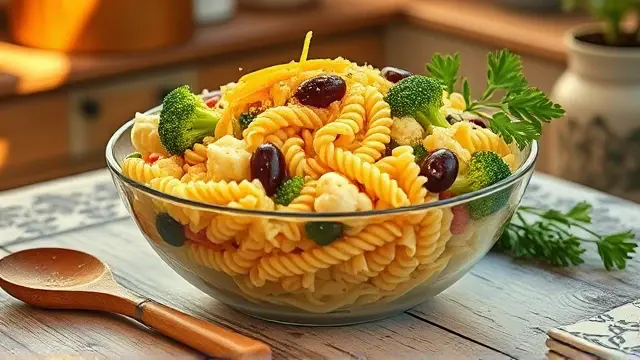 # Vibrant Garden Rotini Salad 🥗🌼 This delightful Garden Rotini Salad is a colorful and healthy dish that’s perfect for summer picnics, potlucks, or as a side dish at family gatherings. It's not only quick and easy to prepare, but it also allows for plenty of creativity—feel free to add your favorite vegetables or proteins! Bursting with fresh flavors and textures, this salad pairs beautifully with grilled meats or can be enjoyed on its own as a light meal. ## Ingredients ### For the salad - 8 ounces (approx. 2½ cups) garden rotini - ¾ cup Italian salad dressing - 1 cup shredded cheddar cheese - 1 cup cauliflower, cut into small pieces - 1 cup broccoli flowerets - ¼ cup finely chopped red onion - ½ cup sliced ripe olives ## Instructions 1. **Cook the Pasta**: Bring a large pot of salted water to a boil. Add the garden rotini and cook according to package instructions until al dente. Drain and rinse under cold water to stop the cooking process. > 💧 Rinsing the pasta not only cools it down but also helps prevent it from sticking together. 2. **Mix the Ingredients**: In a large bowl, combine the cooled rotini, cauliflower, broccoli, red onion, and olives. Toss well to mix everything together. 3. **Dress the Salad**: Drizzle the Italian salad dressing over the pasta and vegetable mixture. Add shredded cheddar cheese and gently toss until everything is well coated. > 🧀 Feel free to experiment with different types of cheese such as feta or mozzarella for a unique twist! 4. **Chill & Serve**: Cover the bowl and refrigerate for at least 30 minutes before serving to allow the flavors to meld together. > ❄️ This salad tastes even better after sitting for a while, making it a great make-ahead option! ## Variations - **Protein Boost**: Add cooked grilled chicken, turkey, or chickpeas for a protein-packed version of this salad. - **Vegetarian Delight**: Incorporate other seasonal vegetables such as bell peppers, cherry tomatoes, or avocado for added nutrients and color. - **Spicy Kick**: Toss in a few jalapeño slices or a dash of red pepper flakes for some heat! - **Make it Gluten-Free**: Swap out the garden rotini with gluten-free pasta for everyone to enjoy! Enjoy your fresh and beautiful Garden Rotini Salad! It's sure to bring a smile to your table! 🌟🥗name