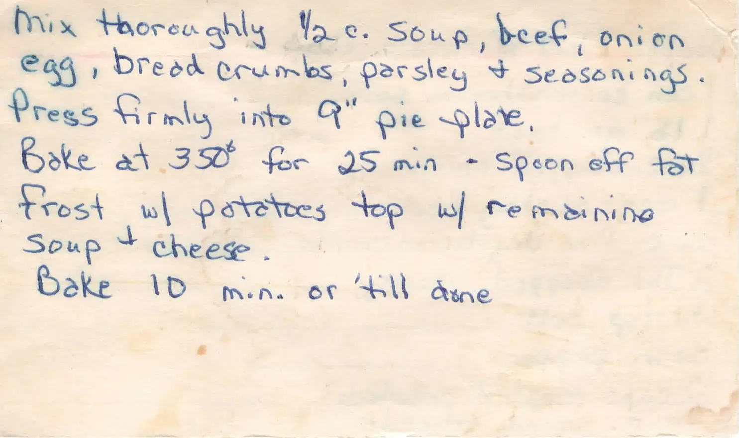 soup or meat and potatoes pie. One can cream of mushroom soup, one pound of ground beef, one quarter cup chopped onion, one egg slightly beaten, one quarter cup fine dry breadcrumbs, two tablespoons chopped parsley, one quarter teaspoon salt, dash of pepper, two cups of mashed potatoes, one quarter cup shredded cheese. Mix thoroughly one half cup soup, beef, onion, egg, breadcrumbs, parsley, and seasonings. Press firmly into 9 inch pie plate. Bake at 350 degrees for 25 minutes. Spoon off the fat. Frost with potatoes, top with remaining soup and cheese. Bake for 10 minutes or until done.llm