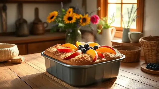**Introducing Blueberry Peach Coffee Cake: A Sweet and Delicious Twist on a Classic Recipe** This summer, why not mix things up with a coffee cake that combines the sweetness of peaches and blueberries? This recipe is an easy and delicious way to enjoy the flavors of both fruits in one moist and flavorful dessert. With its crumbly cinnamon topping and juicy fruit, this Blueberry Peach Coffee Cake is sure to become a new favorite. **Ingredients:** * 1 package blueberry muffin mix * 1 can (1 lb) sliced peaches, drained * 1/4 cup sugar * 1/2 teaspoon cinnamon * 2 tablespoons butter or margarine * Blueberries (fresh or frozen) **Directions:** 1. Preheat oven to 400°F (200°C). Wash and drain the blueberries. 2. Spread the fruit on paper towels and set aside. 3. In a small bowl, combine sugar, flour, and cinnamon. Cut in butter until mixture forms a crumbly topping. 4. Mix muffin batter as directed on the package, except do not fold in the blueberries. 5. Spread batter in a greased 8" square pan. 6. Top with drained blueberries and peach slices. 7. Sprinkle cinnamon topping over the fruit. 8. Bake at 400°F (200°C) for about 25 minutes, or until golden brown. **Suggested Variations:** * Add a splash of vanilla extract to the batter for extra flavor * Substitute other fruits like strawberries or raspberries for the blueberries and peaches * Use fresh peaches instead of canned, if in season * Try using different types of sugar, such as brown sugar or honey, in the toppingname