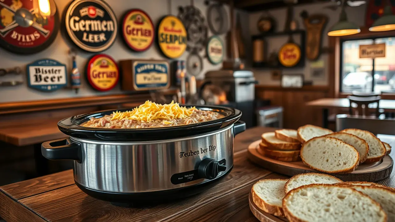 Ruben dip. Ingredients. Four packages of two ounces each of thinly sliced deli corned beef finely chopped. One package, which is eight ounces of cream cheese, cubed. One can, which is eight ounces of sauerkraut, rinsed and drained. One cup, which is eight ounces of sour cream. And one cup, which is four ounces of shredded Swiss cheese. Then rye bread or crackers. Directions. In a one and one half quart slow cooker, combine the first five ingredients. Cover and cook on low for two hours or until cheese is melted. Stir until blended. Serve warm with bread or crackers. Yields about four cups.llm