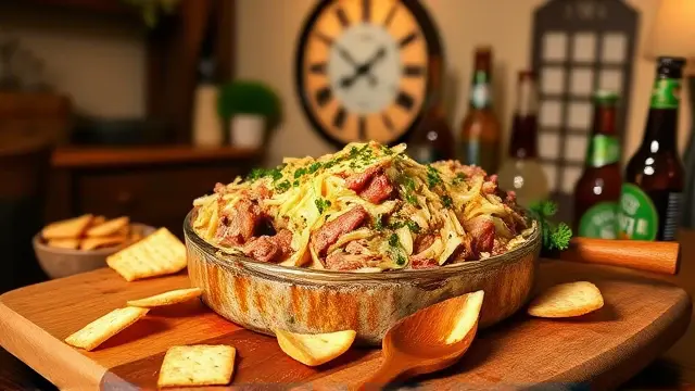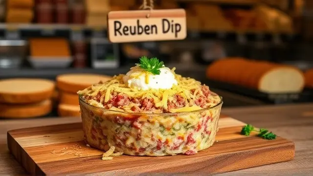 **Reuben Dip** ================ Are you in the mood for a creamy, savory dip that's perfect for snacking or entertaining? Look no further than this delicious Reuben Dip! Inspired by the classic sandwich, this recipe brings together the flavors of corned beef, sauerkraut, and Swiss cheese in a smooth and tangy dip. **Ingredients** --------------- * 4 packages (2 oz each) thinly sliced deli corned beef, finely chopped * 1 package (8 oz) cream cheese, cubed * 1 can (8 oz) sauerkraut, rinsed and drained * 1 cup sour cream * 1 cup shredded Swiss cheese **Directions** -------------- 1. In a 1 1/2 quart slow cooker, combine the chopped corned beef, cubed cream cheese, sauerkraut, and sour cream. 2. Cover and cook on low for 2 hours or until the cheese is melted. 3. Stir until blended to ensure a smooth dip. 4. Serve warm with rye bread or crackers. **Suggested Variations** ------------------------ * For an extra kick, add some diced jalapeños or hot sauce to give the dip a spicy twist! * If you prefer a lighter dip, use less cream cheese or substitute with Greek yogurt. * Experiment with different types of cheese, such as cheddar or gouda, for a unique flavor profile.name