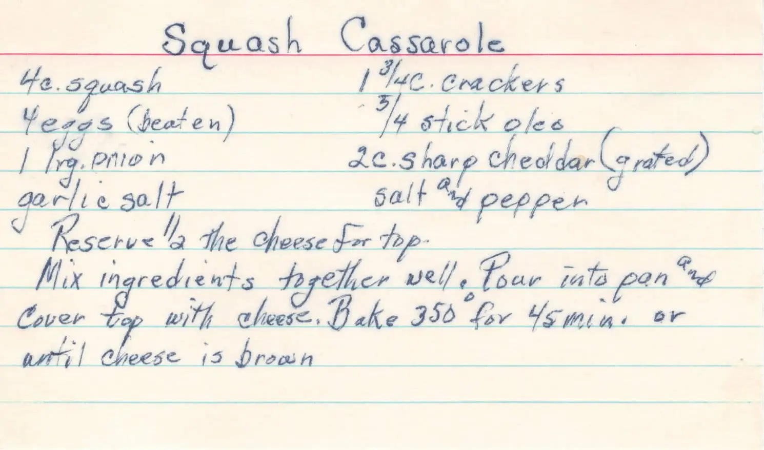 Squash casserole. Four cups of squash. Four eggs, beaten. One large onion. Garlic salt. One and three quarters cup of crackers. Three quarters of a stick of olio. Two cups of sharp cheddar, grated. Salt and pepper. Reserve half the cheese for the top. Mix ingredients together well. Pour into pan and cover top with cheese. Bake at 350 degrees for 45 minutes or until cheese is brown.llm